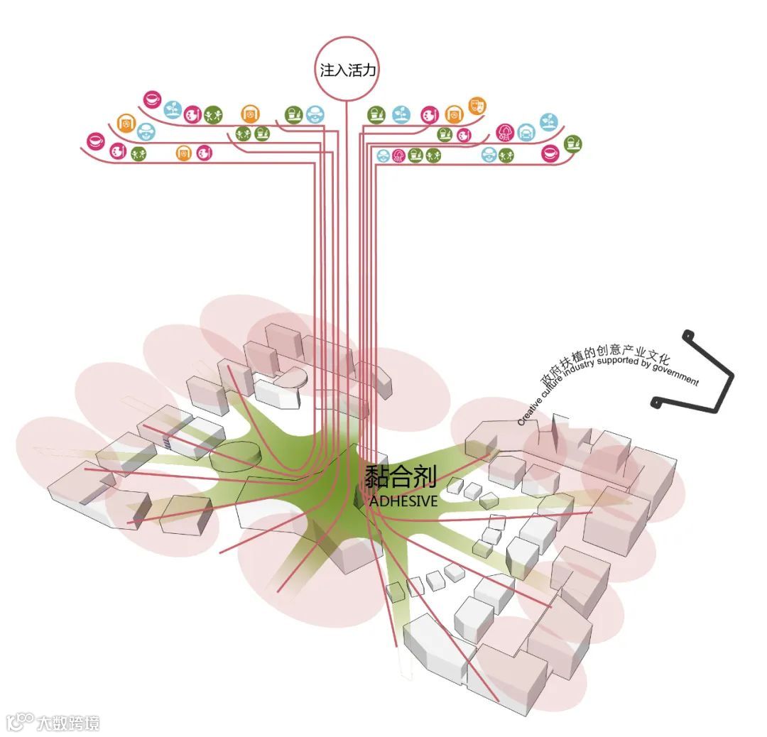 科学中枢,技艺纽带:园区采用“一心四组团”的布局模式,综合楼在园区正中,通过其内部复合多样的功能将独立研究院组团、配套服务组团及孵化加速组团组织起来,基于应用技术研究院园区核心功能,引入“中枢、纽带”设计概念,强化综合楼在科技园区中的重要位置。