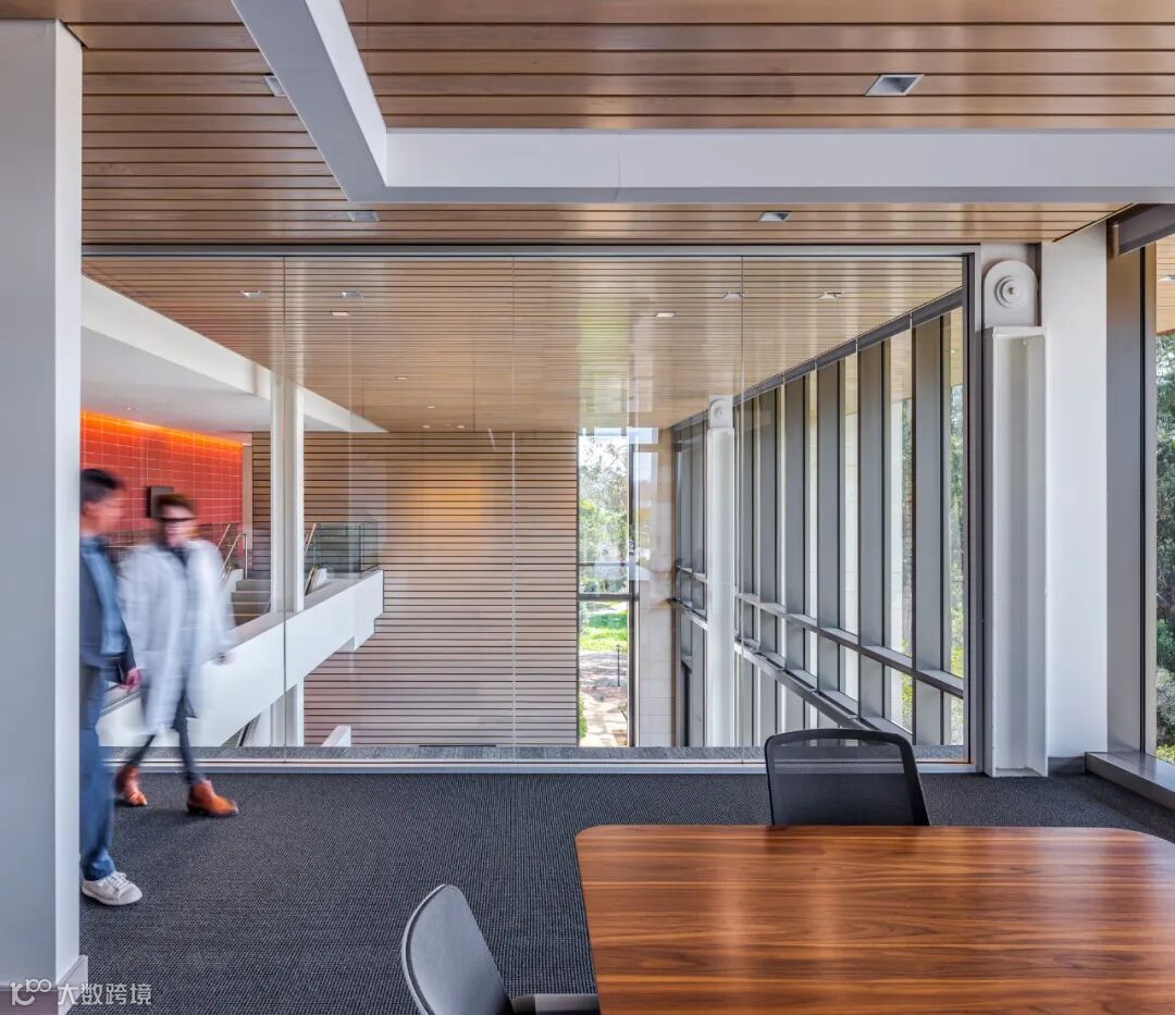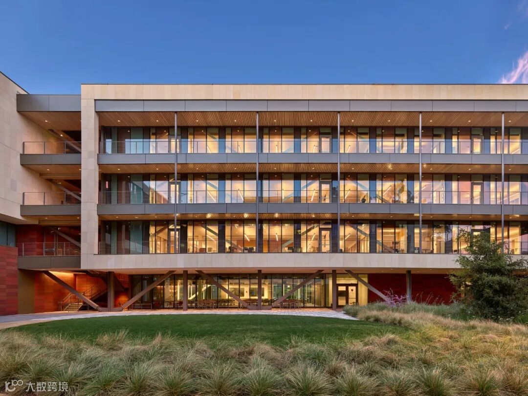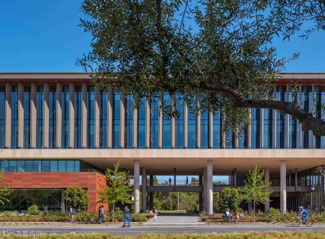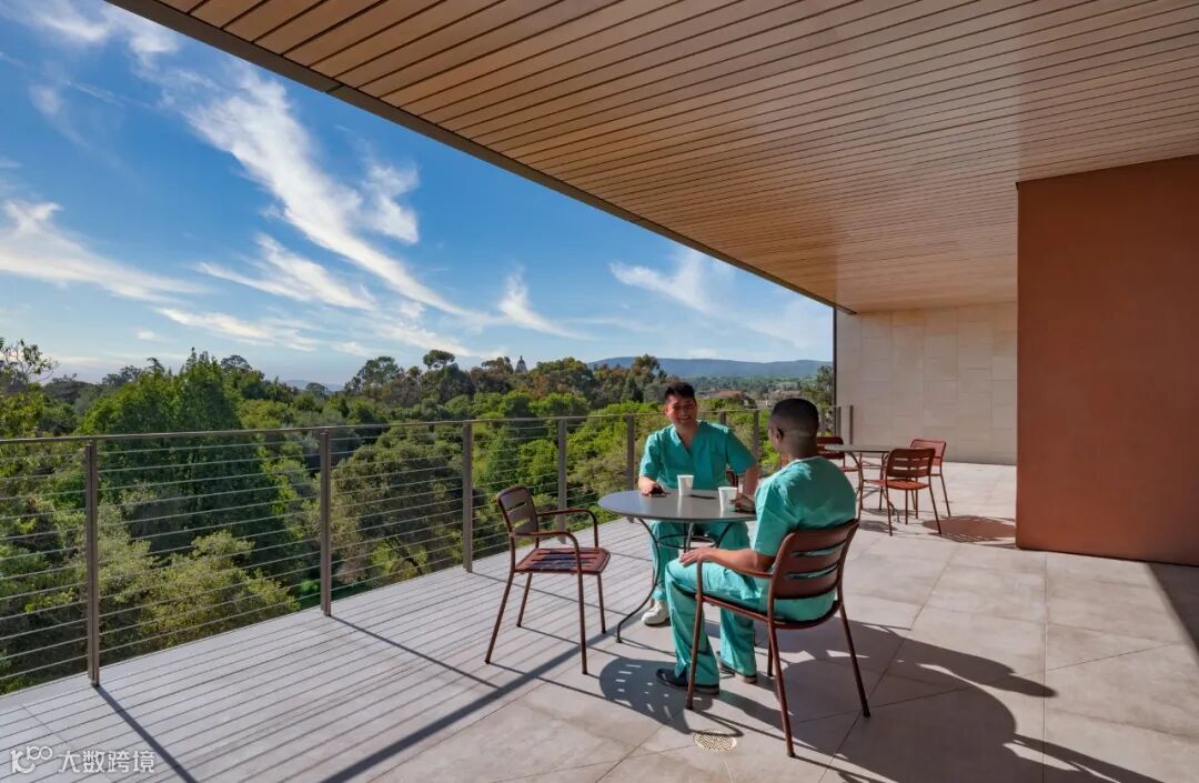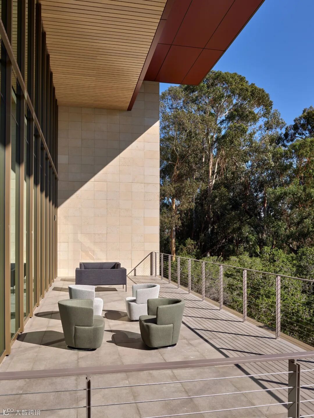 该设施包括办公室、会议室、协作和教育空间、一个健身中心和一个餐厅式咖啡馆。HOK的团队帮助医学院的领导规划了他们的新办公空间,并制定了详细的方案,在一个高度协作的工作环境中容纳所有的临床教师和工作人员。 HOK designed the Stanford Center for Academic Medicine to provide respite for staff that works long hours in hospitals and clinics. It also accommodates their academic and research endeavors. The facility includes offices, conference rooms, collaboration, and education spaces, a fitness center, and a restaurant-style café. HOK’s team helped the medical school’s leaders plan their new office space and develop a detailed program that would accommodate all clinical faculty and staff in a highly collaborative work environment. 三个狭窄的、相互连接的办公室翼楼耸立在一个种植有本地物种的景观庭院之上。西侧的办公翼被抬高到地面以上,在下面形成一个大型的两层门廊。这座U型建筑从所有有利位置都能看到大自然的景色。 The building massing serves as a threshold between the Stanford Medicine academic and the clinical campus in Palo Alto and the adjacent Frederick Law Olmsted-designed arboretum. Three narrow, interconnected office wings rise above a landscaped courtyard planted with native species. The west office wing is lifted above the ground, forming a large, two-story porch below. The U-shaped building provides views of nature from all vantage points. 人们可以在一个多样化的户外空间组合中进行社交和工作。门廊、阳台、天桥和有顶的人行道从建筑中延伸出来。上面的露台创造了一种在树上的感觉。这些空间在夏天经历微风和阴凉,在冬天经历平静和阳光直射。被动优先的设计方法充分利用了场地的优势。阳光、风和生态系统影响了从最初的规划决定到建筑细节的一切。狭窄的建筑侧翼加上落地窗,使大量的自然光和树木园的景观得以实现。 幕墙与陶瓷熔块图案和西立面的三层金属百叶一起,最大限度地减少眩光,同时优化室内的热舒适和日光。该建筑的年度能源使用强度为15.9 kBtu/SF/年(包括可再生能源),比基线节省了85%的能源。 平面图设计理念