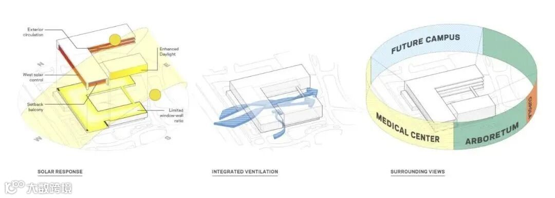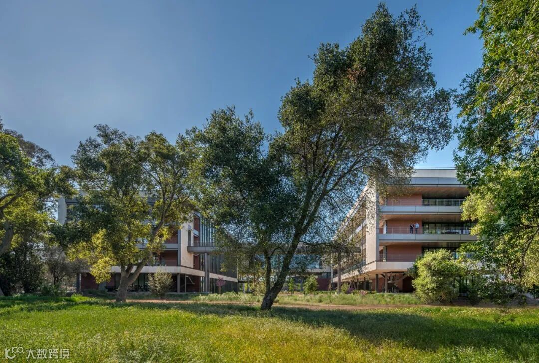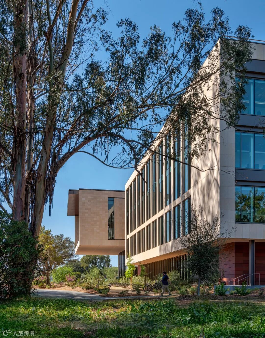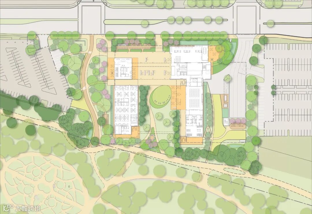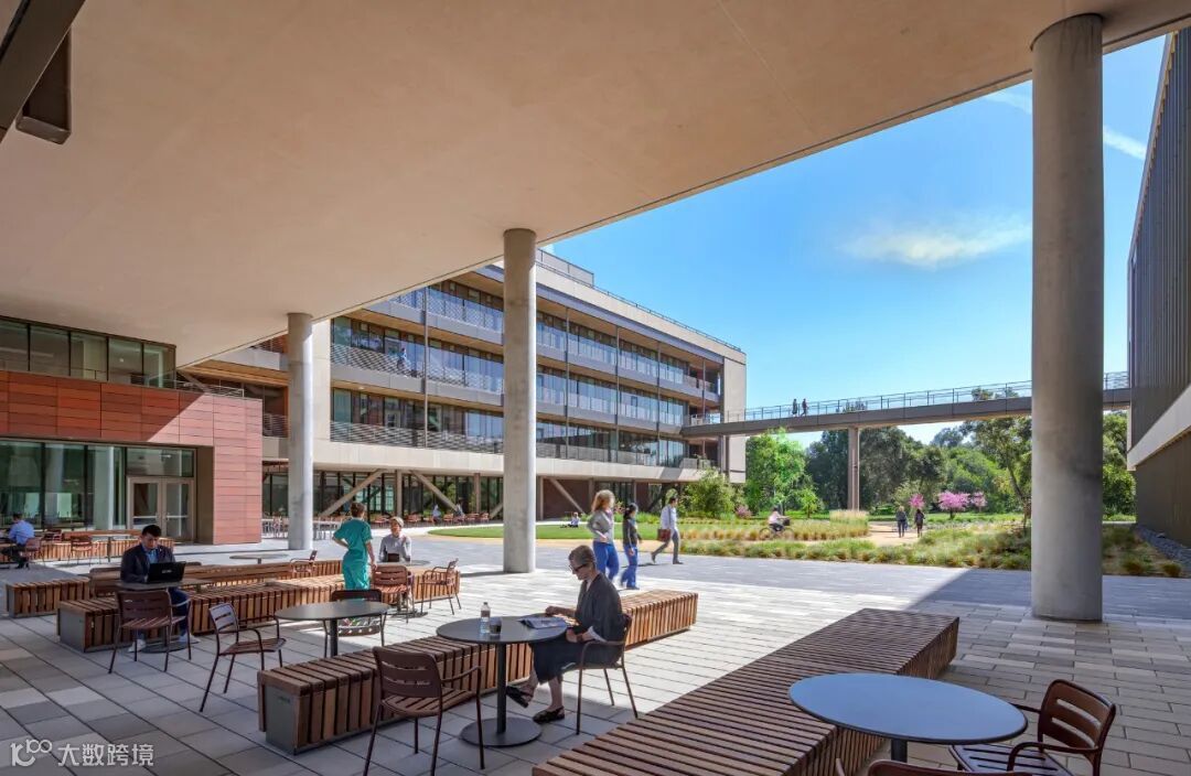 该设施包括办公室、会议室、协作和教育空间、一个健身中心和一个餐厅式咖啡馆。HOK的团队帮助医学院的领导规划了他们的新办公空间,并制定了详细的方案,在一个高度协作的工作环境中容纳所有的临床教师和工作人员。 HOK designed the Stanford Center for Academic Medicine to provide respite for staff that works long hours in hospitals and clinics. It also accommodates their academic and research endeavors. The facility includes offices, conference rooms, collaboration, and education spaces, a fitness center, and a restaurant-style café. HOK’s team helped the medical school’s leaders plan their new office space and develop a detailed program that would accommodate all clinical faculty and staff in a highly collaborative work environment. 三个狭窄的、相互连接的办公室翼楼耸立在一个种植有本地物种的景观庭院之上。西侧的办公翼被抬高到地面以上,在下面形成一个大型的两层门廊。这座U型建筑从所有有利位置都能看到大自然的景色。 The building massing serves as a threshold between the Stanford Medicine academic and the clinical campus in Palo Alto and the adjacent Frederick Law Olmsted-designed arboretum. Three narrow, interconnected office wings rise above a landscaped courtyard planted with native species. The west office wing is lifted above the ground, forming a large, two-story porch below. The U-shaped building provides views of nature from all vantage points. 人们可以在一个多样化的户外空间组合中进行社交和工作。门廊、阳台、天桥和有顶的人行道从建筑中延伸出来。上面的露台创造了一种在树上的感觉。这些空间在夏天经历微风和阴凉,在冬天经历平静和阳光直射。被动优先的设计方法充分利用了场地的优势。阳光、风和生态系统影响了从最初的规划决定到建筑细节的一切。狭窄的建筑侧翼加上落地窗,使大量的自然光和树木园的景观得以实现。 幕墙与陶瓷熔块图案和西立面的三层金属百叶一起,最大限度地减少眩光,同时优化室内的热舒适和日光。该建筑的年度能源使用强度为15.9 kBtu/SF/年(包括可再生能源),比基线节省了85%的能源。 平面图设计理念