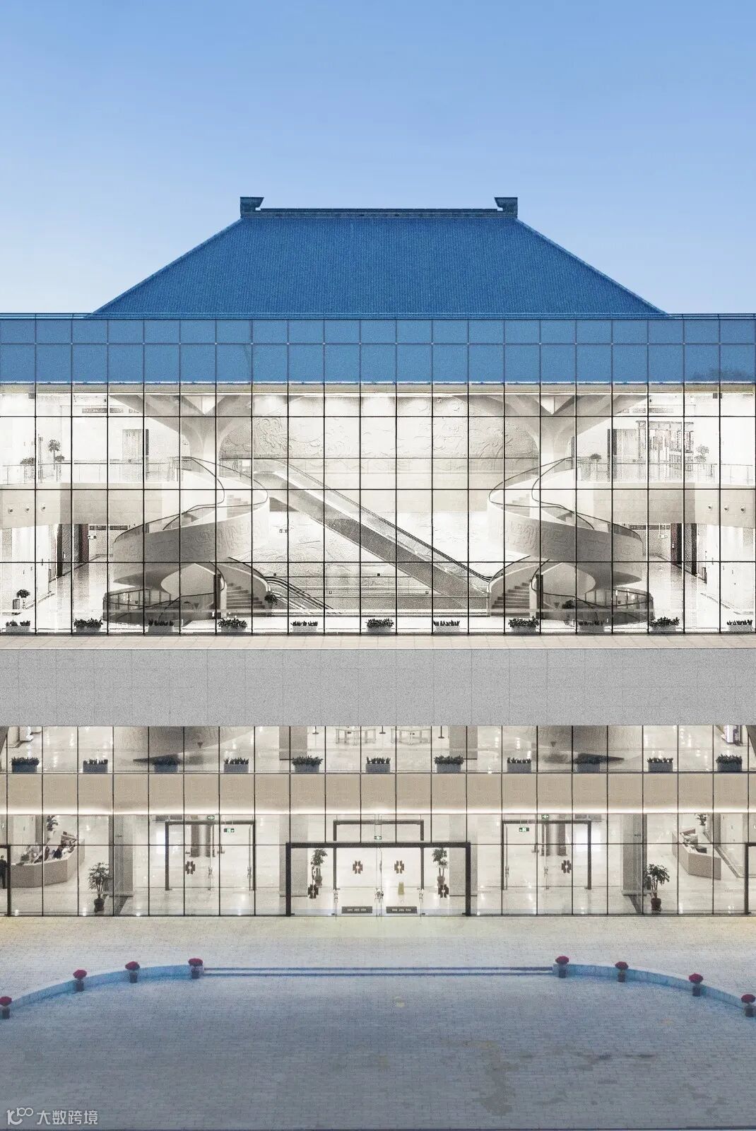 博物馆藏品青铜器—簠。老馆屋顶呈现梯形的形态,新馆与之相对应采用倒梯形的几何形体,两者正好与簠的形态吻合。