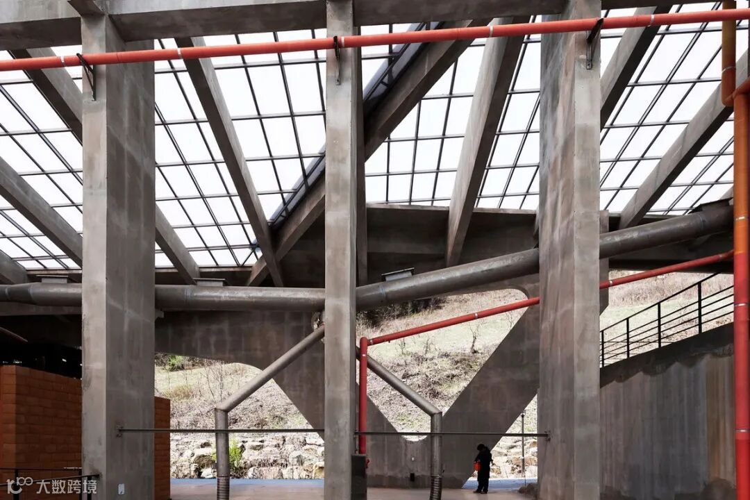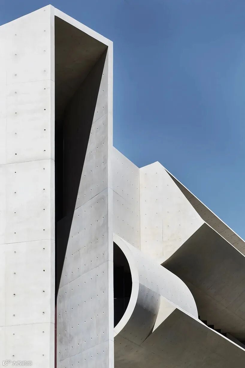 暴露的大块混凝土墙之间,通过可穿透的掏空,形成了有趣的空间韵律,变化的构成营造出生动的穿孔空间。