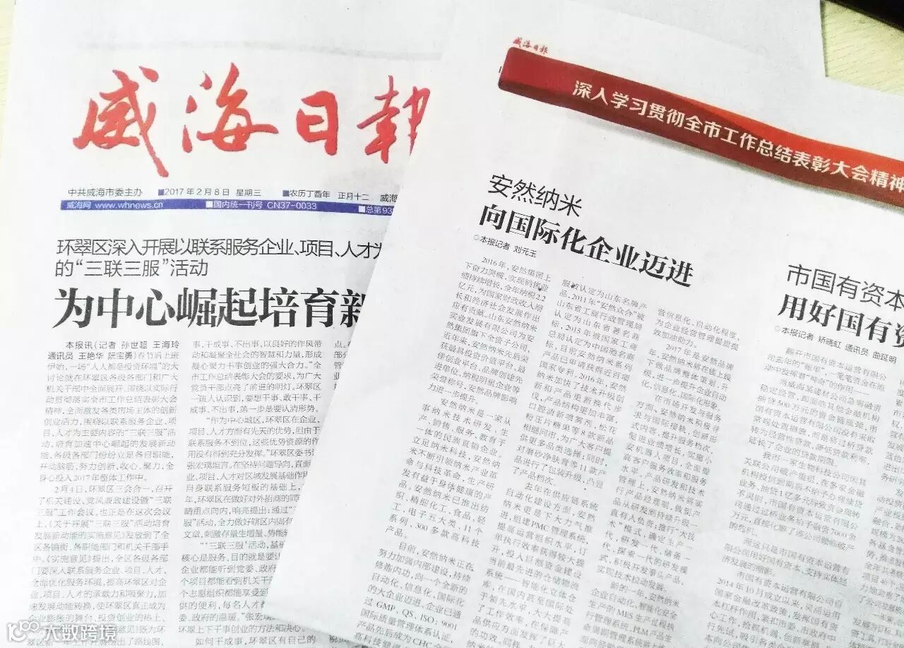 《威海日报》近日刊登了《安然纳米——向国际化企业迈进》的文章。文章回首安然公司2016年发展历程,展望2017新蓝图,并对安然2017年品牌年的建设目标做了介绍。从新产品研发上市到信息化项目,再到品牌的整体升级,无一不体现安然公司做国际化企业的决心!