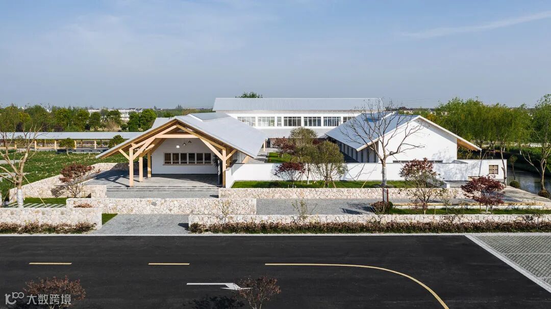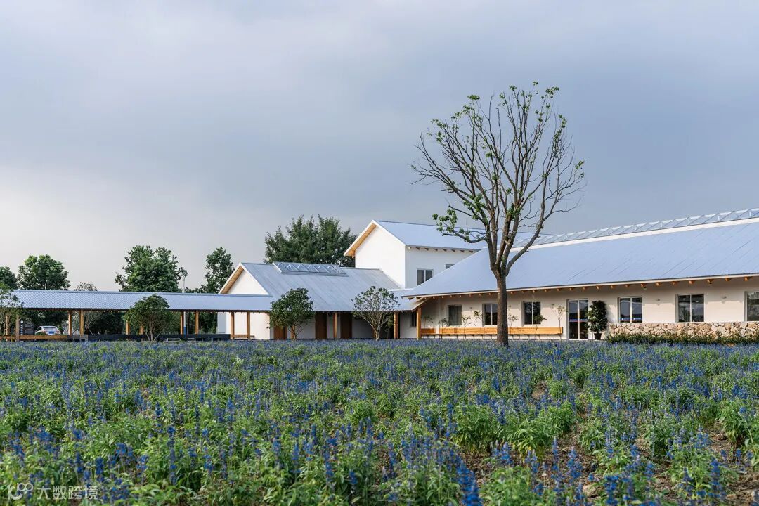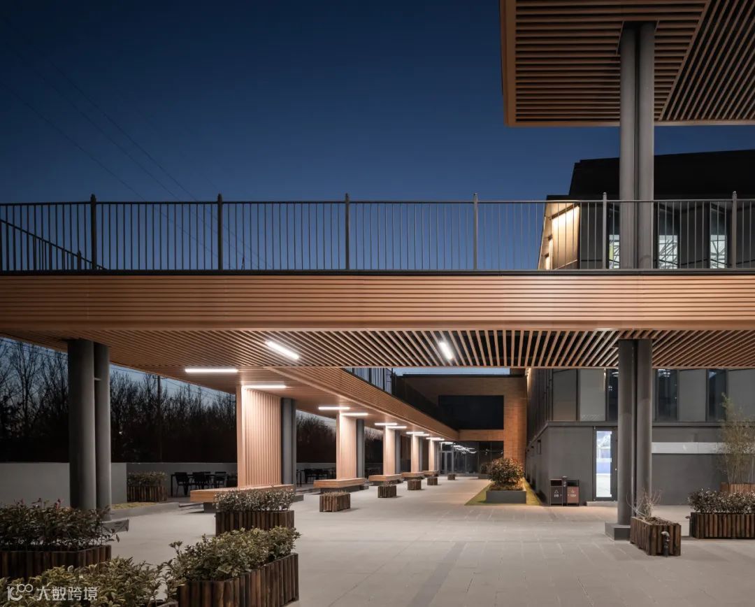 办公楼西端的轻钢临建被改造为公共厕所。西侧花田的北部利用原有的回环道路设置电瓶游览车站,有新建的候车长廊与游客中心相连。北侧的单层小屋作为河边游船码头的候船空间。