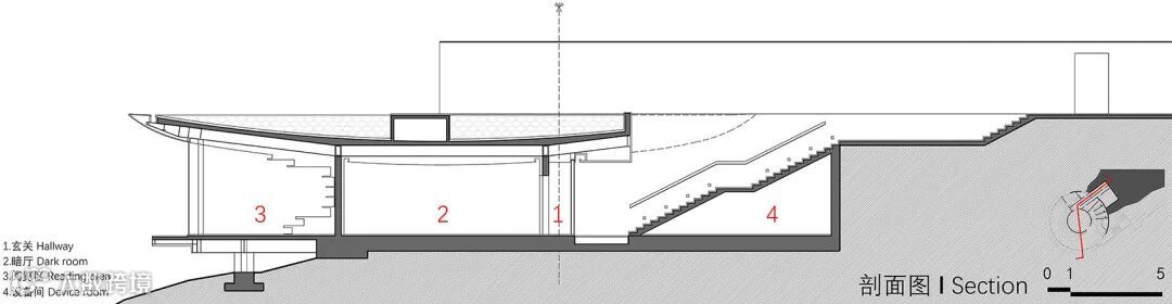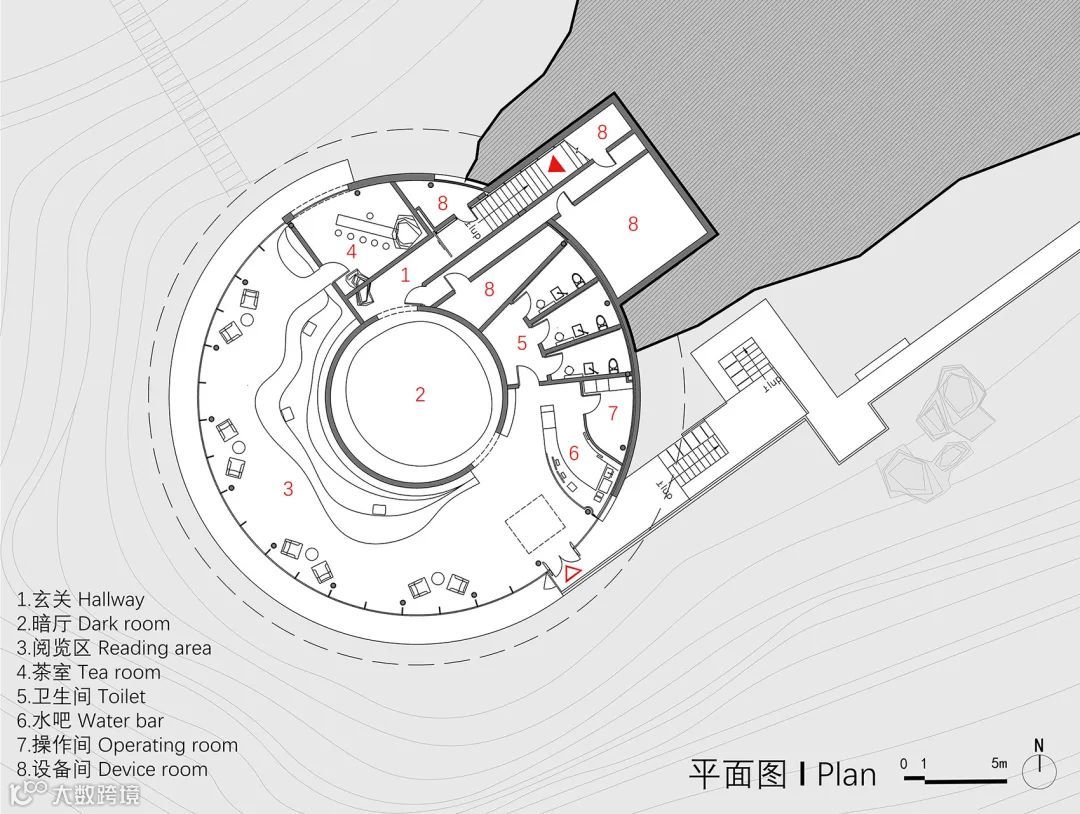 建筑的位置被规划在山顶的端头,根据地形高差布置在崖口处。