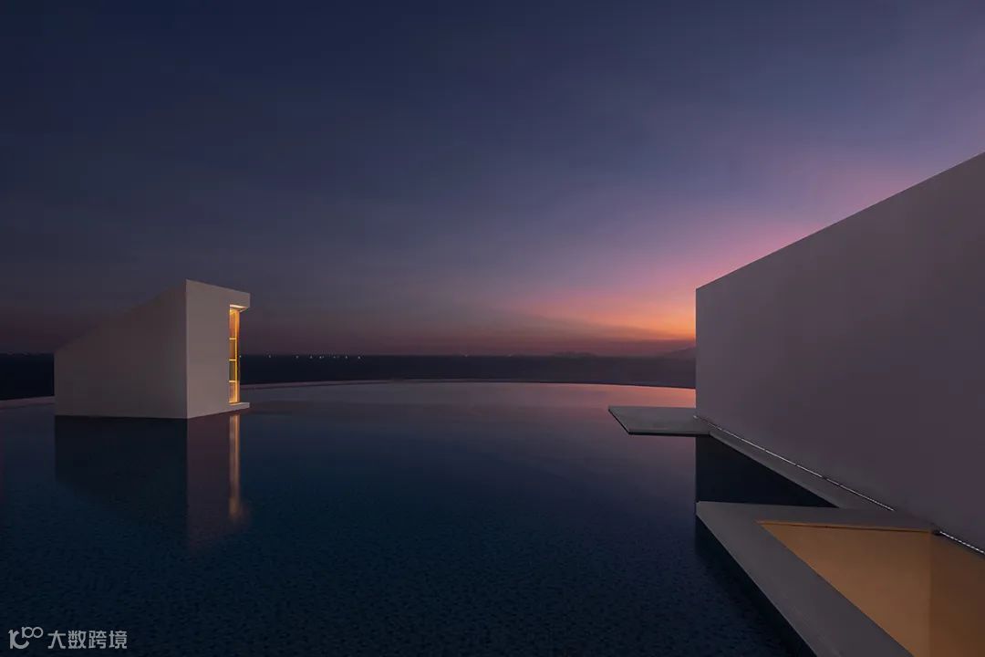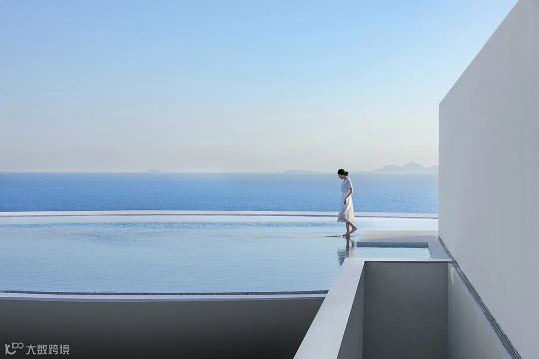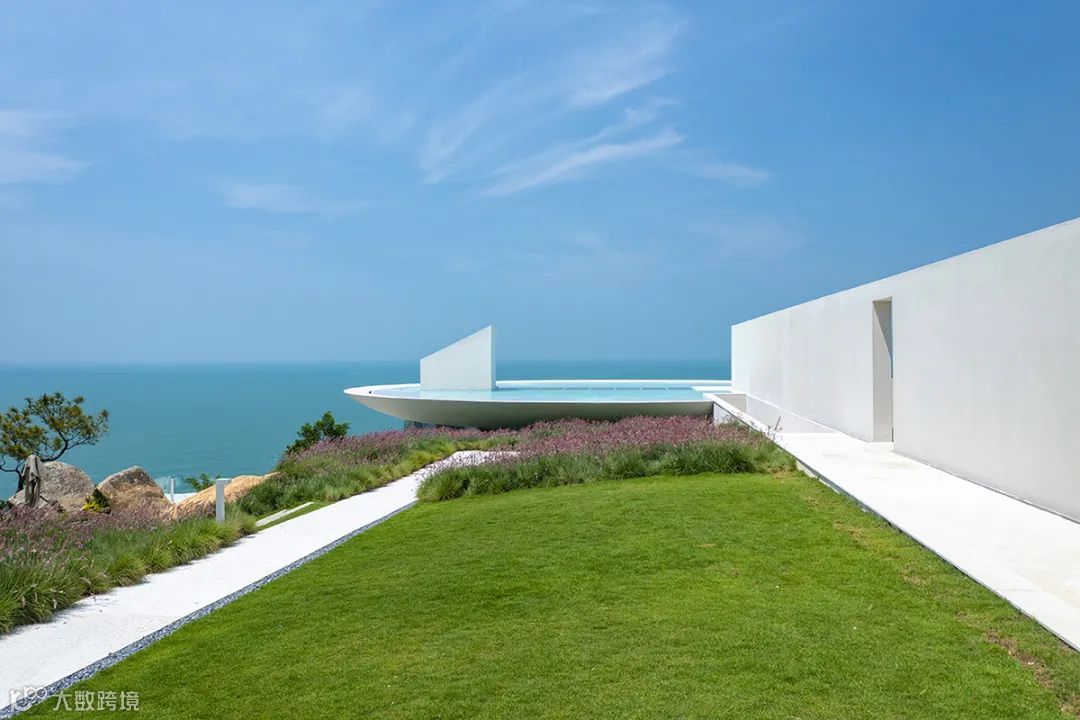 在山顶,白色的走廊和长墙成为自然景观中的人工物,纯粹的几何形体很好的吸引了使用者的注意力,并将人引向屋顶水池和大海的方向。