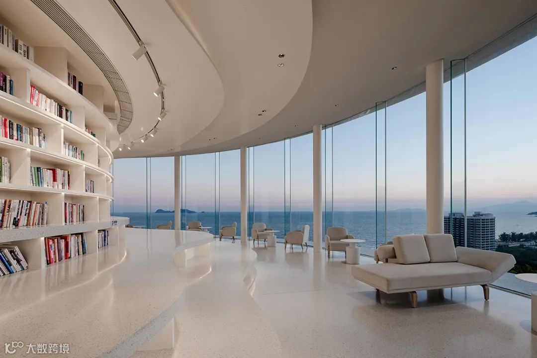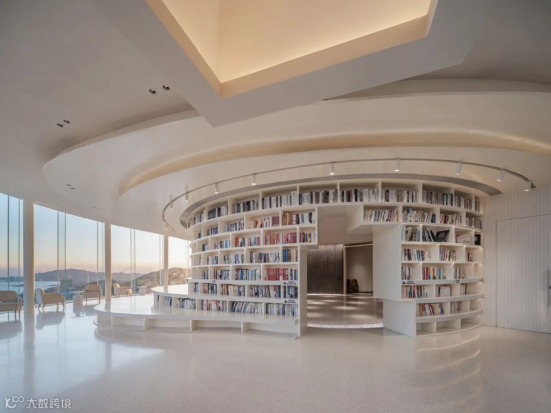 阅读区的室内基调以白、浅灰等亮色为主,利用曲线的造型营造轻松、时尚的氛围。座椅和小桌沿着外围的玻璃幕墙摆放,读者可以在此安静的边阅读,边远眺风景。书架沿内壁环形布置,并在天花和地面区域向外延伸,形成类似云状的造型。延伸到地面部分也成为自由阅读的区域,一些不愿意正襟危坐的读者可以在这里或倚或靠,享受与书籍在一起的下午时光。