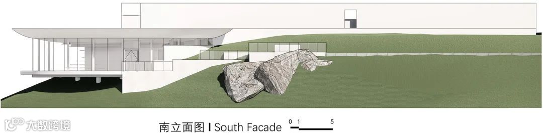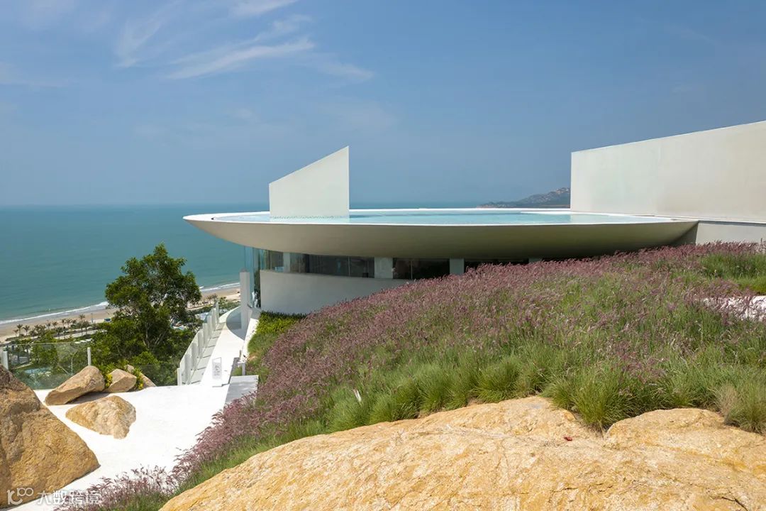 项目的景观力求纯净。作为建筑的基底,山顶的植被以低矮的芒草和绿植为主,它们衬托出建筑干净的形体。场地中的几块巨石被小心的保留,并与路径结合在一起,成为观看建筑时候的前景。
