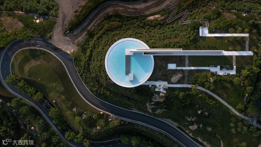 图书馆造型力求具有诗意的张力:从高处俯瞰,建筑很几何化——一个正圆+一条直线。建筑主体部分平面形状为圆形,直线是室外走廊和长墙,它将人从山顶引入建筑。图书馆整体为白色,走廊、长墙和屋顶的边缘强化了几何构成感。建筑屋顶剖面呈碗形,阅读区的透明玻璃使屋顶具有悬浮感。碗状的屋顶内是水池,它给予了建筑一种戏剧性——一座位于水下的图书馆。