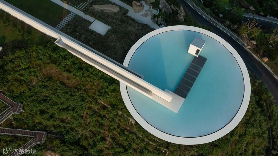 屋顶水池多少带有点乌托邦的成分。建筑师和业主都希望给使用者,乃至这个南方的小城市一些惊喜。客人可以沿着长墙北侧被隐藏的路径到达水池中的小平台,并通过汀步抵达同样位于水池中间的采光口及平台。水池边缘没有设置围栏,这确保了建筑的完整性和纯粹性。但建筑师利用汀步和平台周边的水深限制人进入水池,保证了安全性。从山顶的特定位置望去,视线可以掠过水面看到远处的海平面。水、天、海在此时此地得以融为一体。