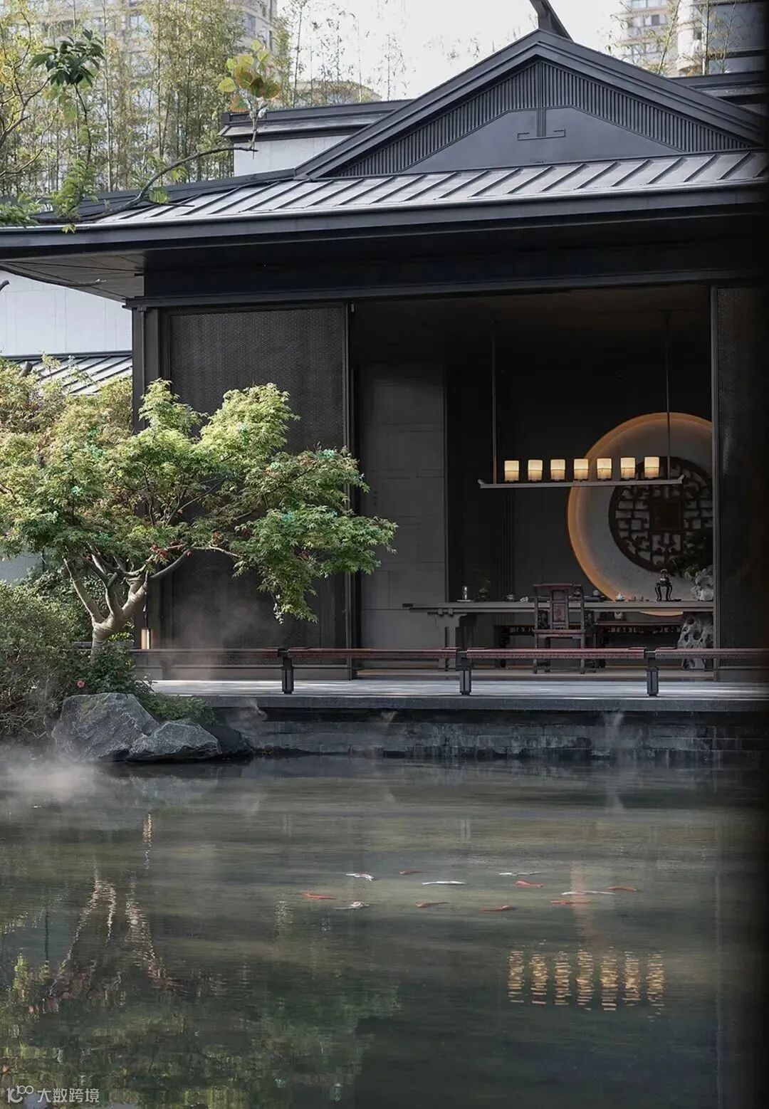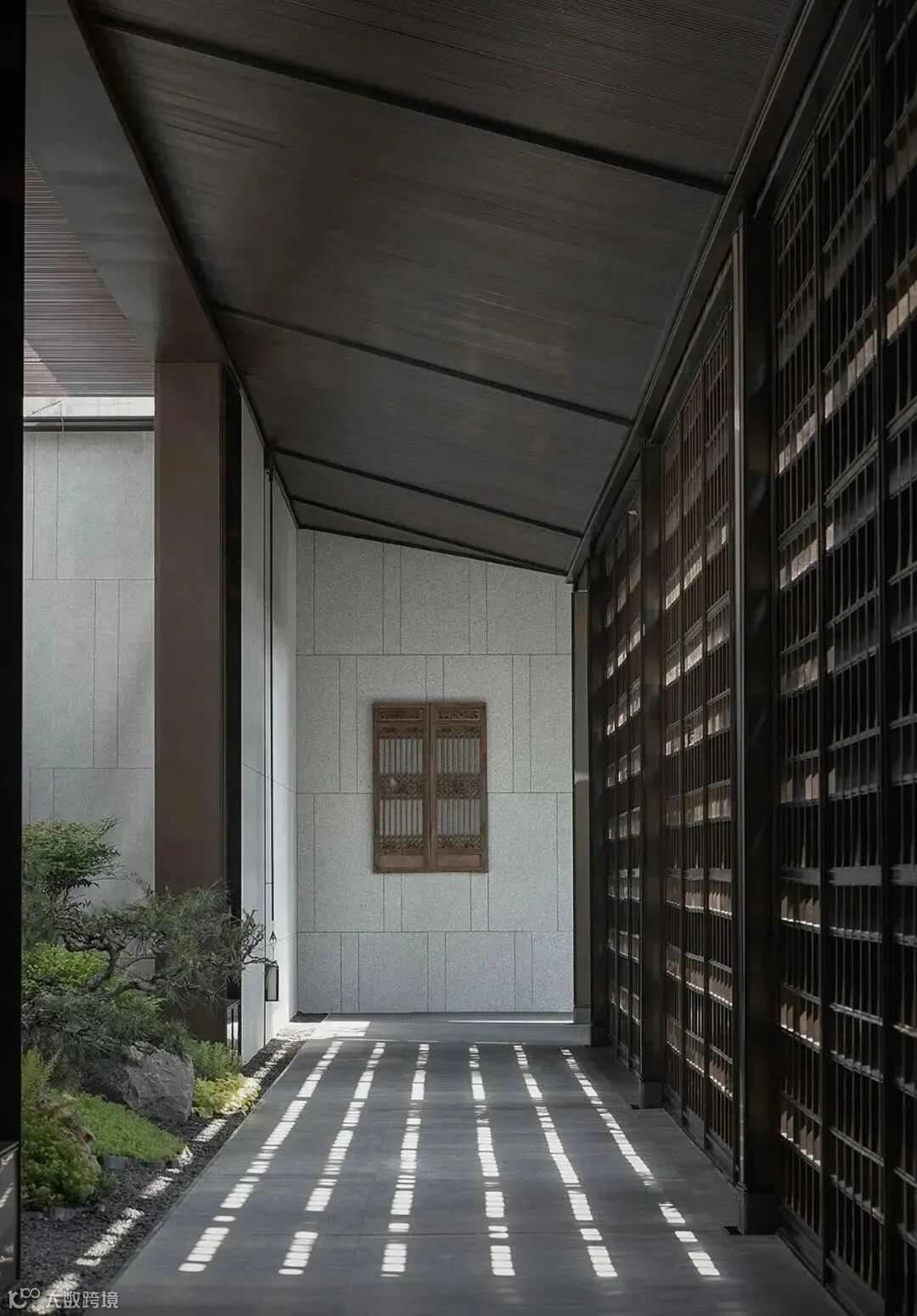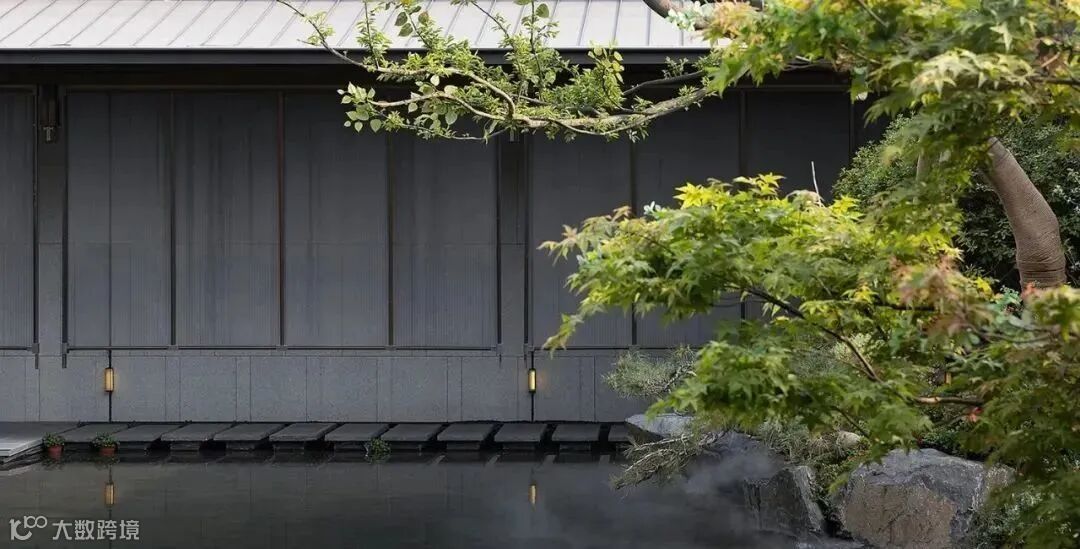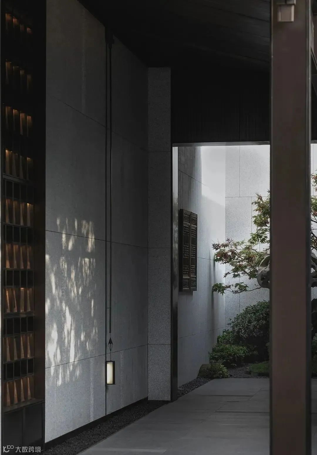 没有明确的标志区分室内外,一旁的小路上泛起微微水光,灰色墙面宛如照相机,尽心尽责地记录下这浪漫的一幕。旁边的独木桥上布有黑色帘幕,格外神秘,悄然与池水草木隔开距离。
