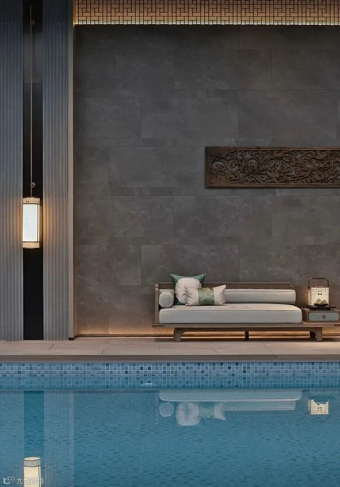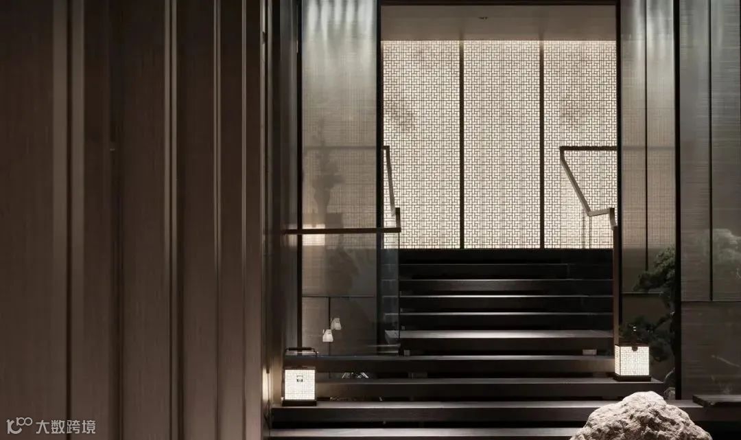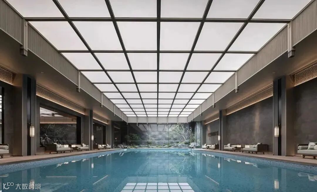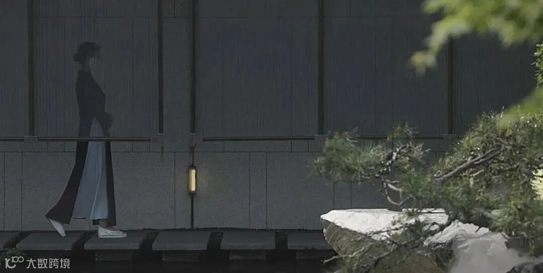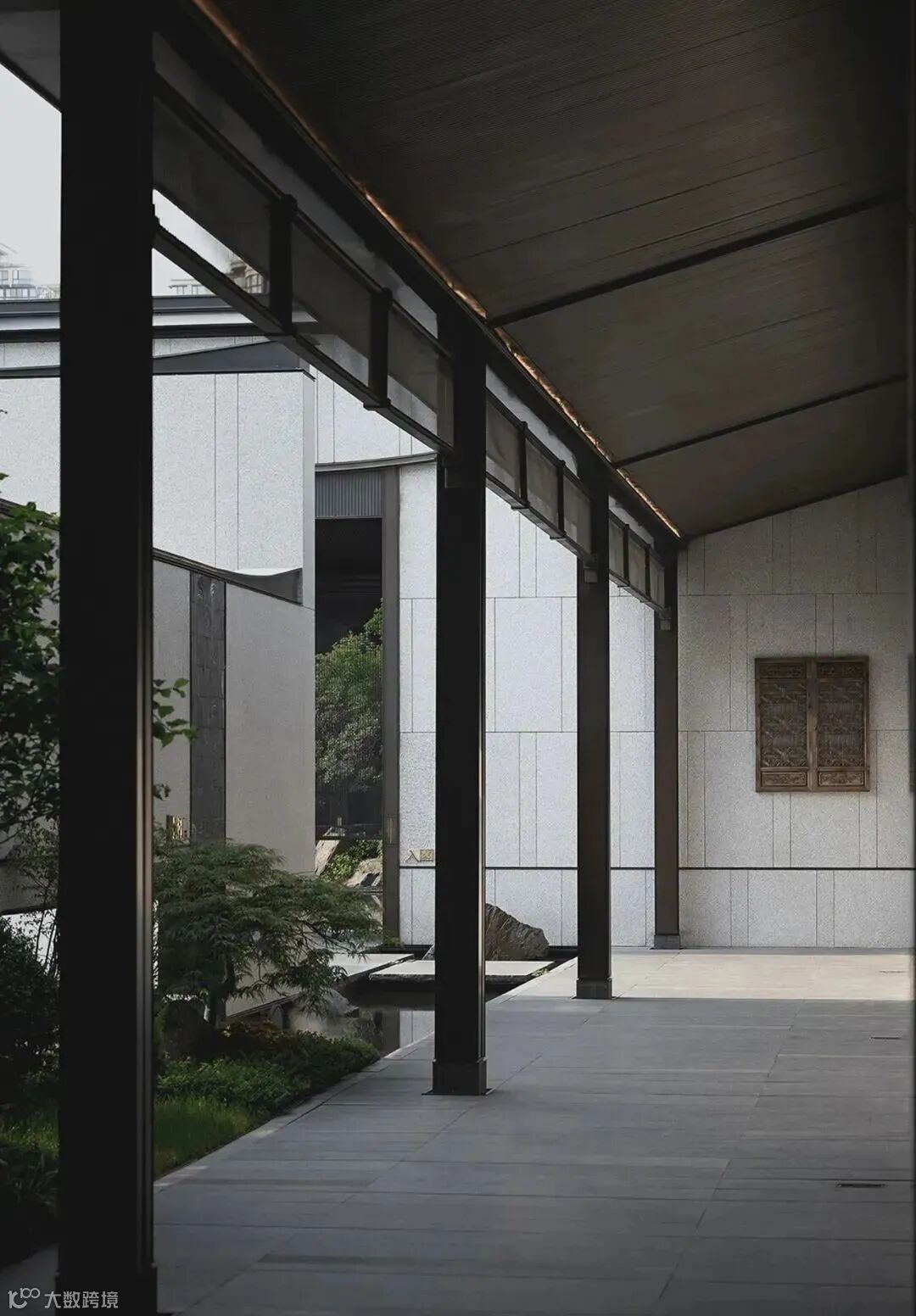 没有明确的标志区分室内外,一旁的小路上泛起微微水光,灰色墙面宛如照相机,尽心尽责地记录下这浪漫的一幕。旁边的独木桥上布有黑色帘幕,格外神秘,悄然与池水草木隔开距离。
