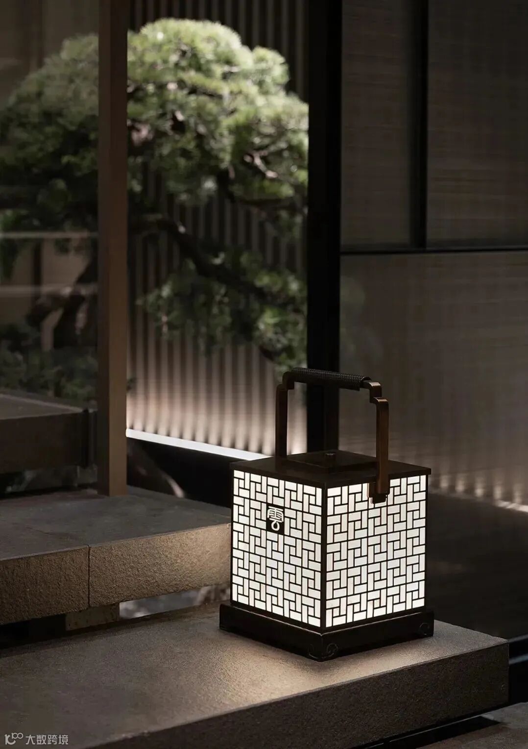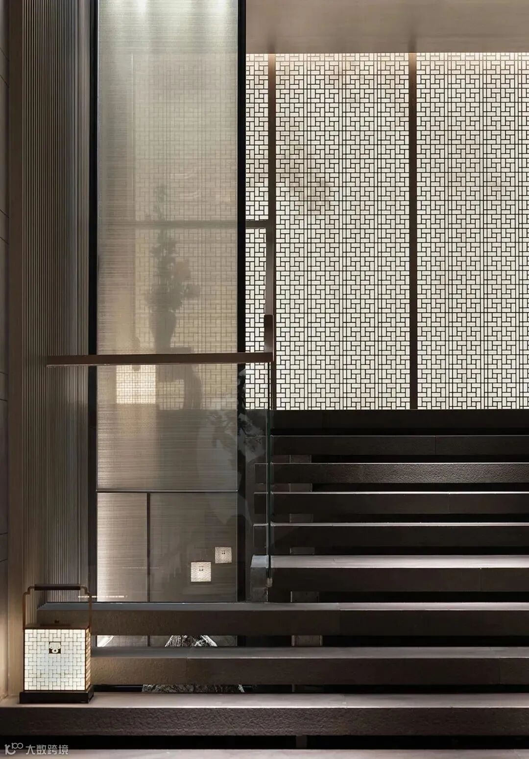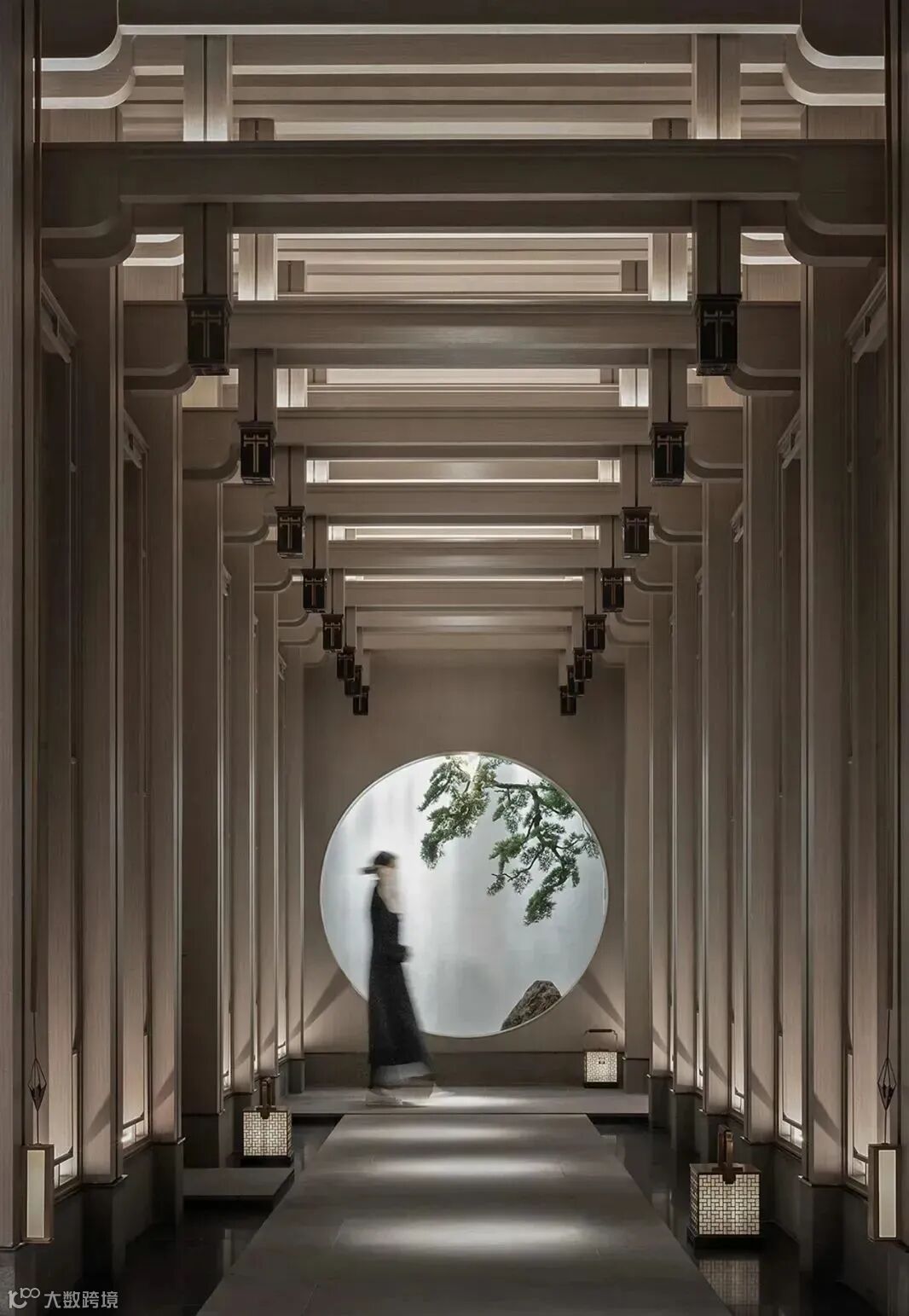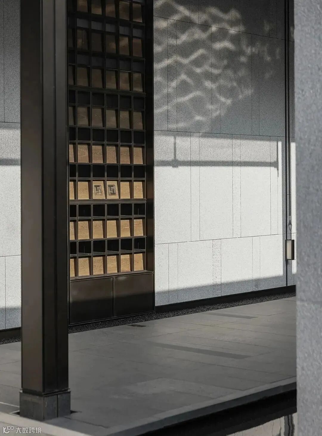 没有明确的标志区分室内外,一旁的小路上泛起微微水光,灰色墙面宛如照相机,尽心尽责地记录下这浪漫的一幕。旁边的独木桥上布有黑色帘幕,格外神秘,悄然与池水草木隔开距离。