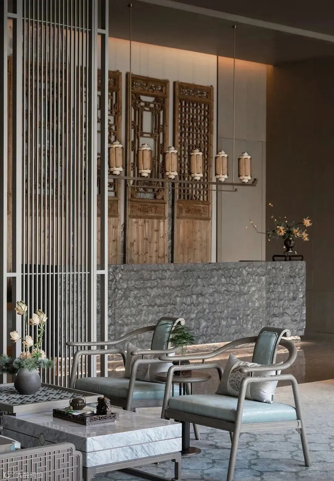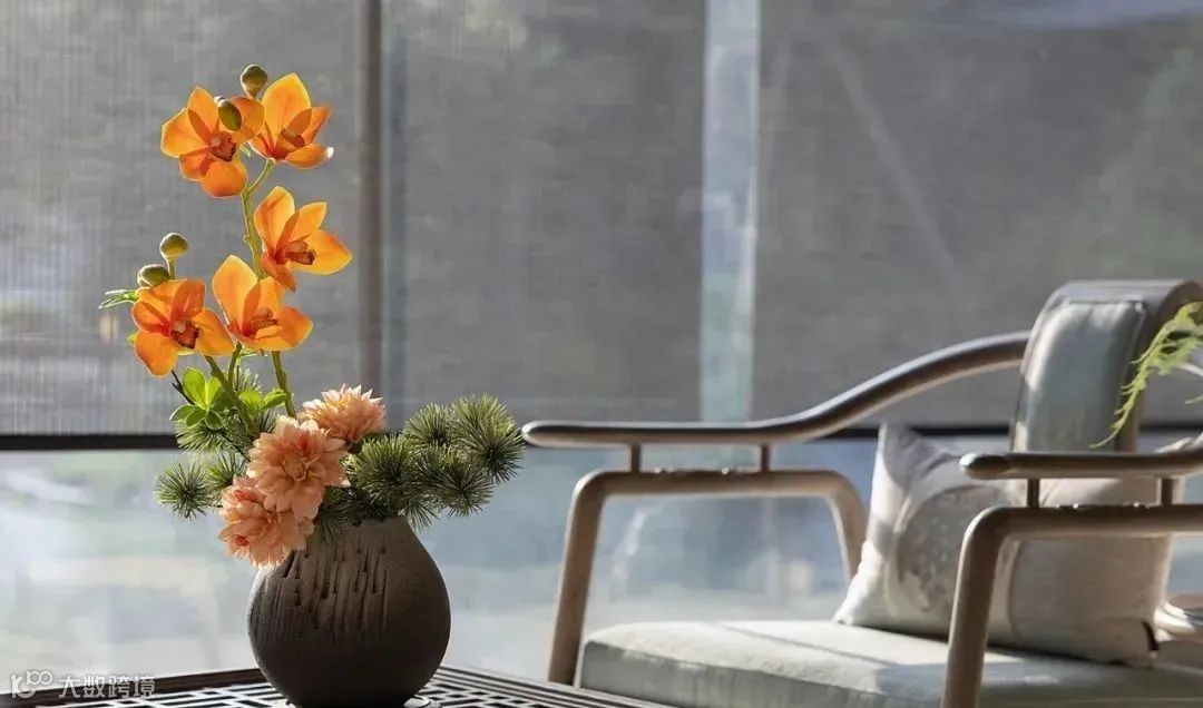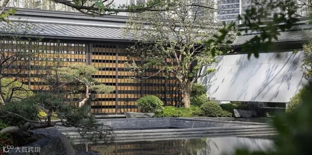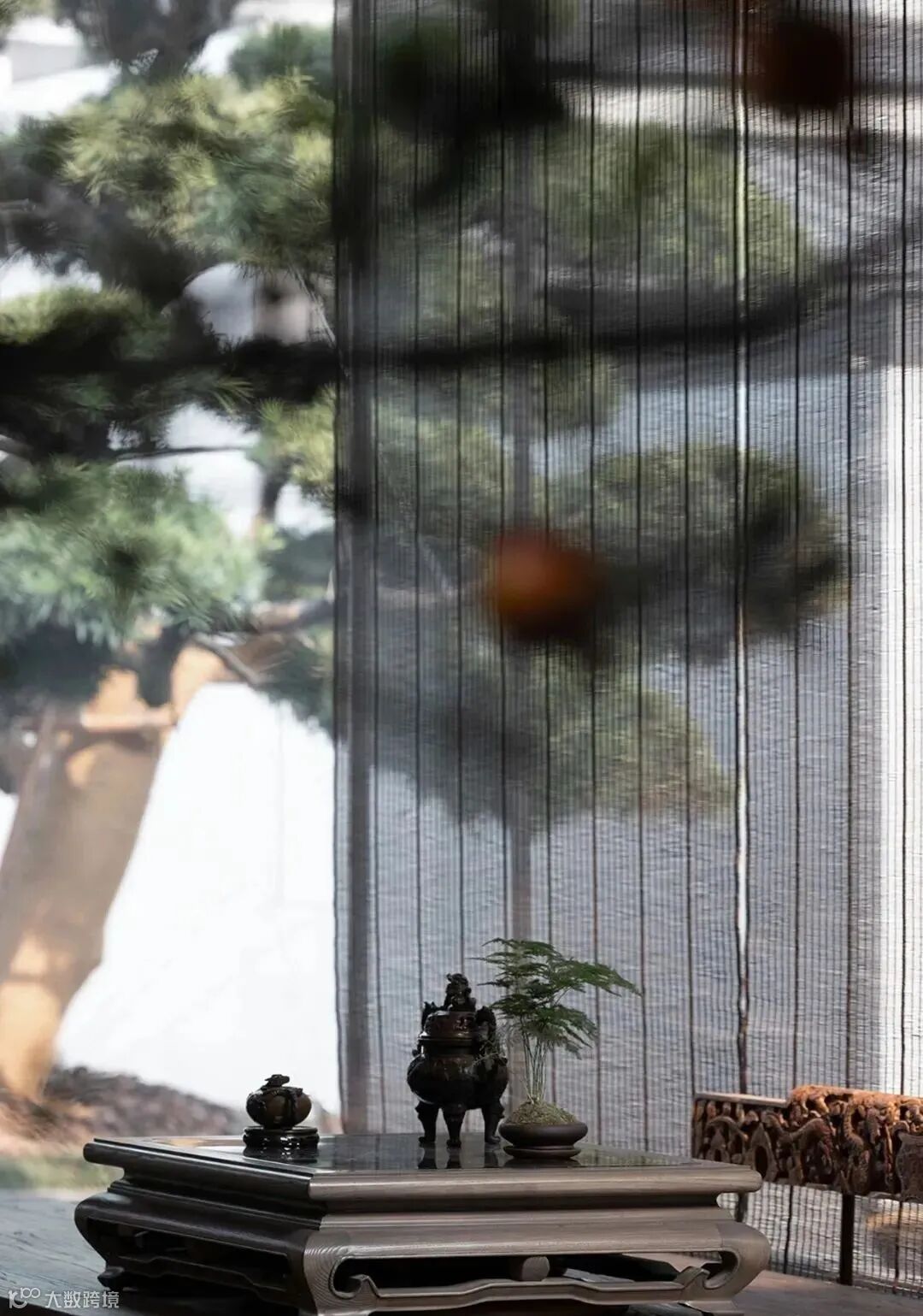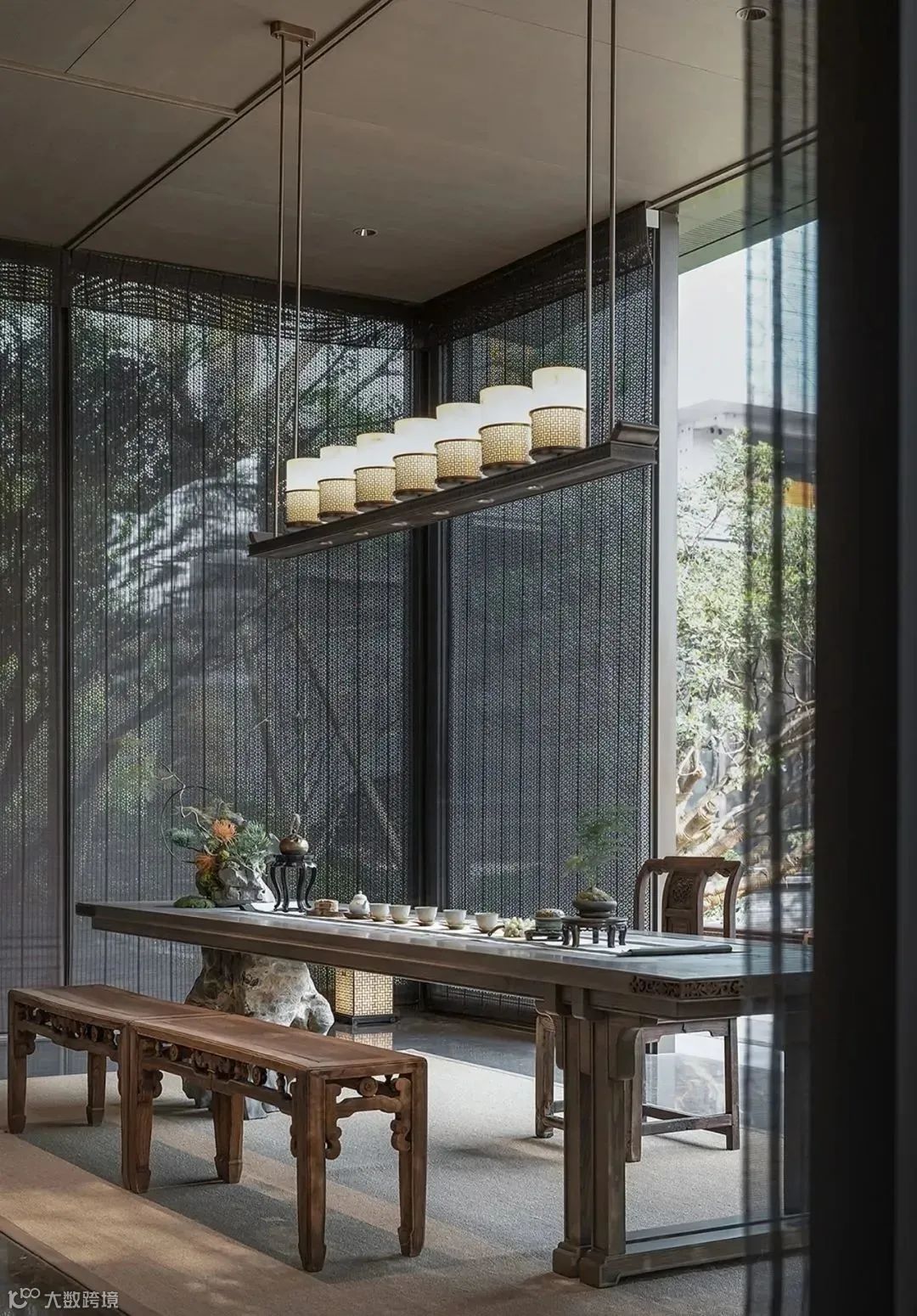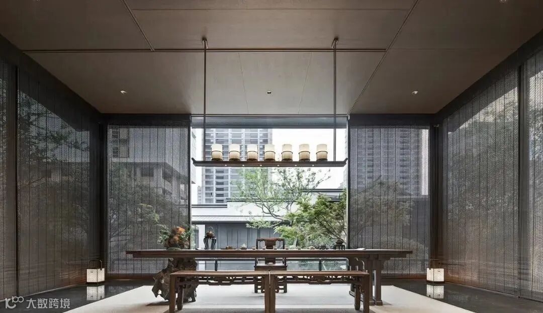 会客区外有座茶室,坐拥一片水景。暗色的纱帘垂在四周,随风舞动,为室内带来变幻万千的光影,来上一杯清茶,闻着清香,看着水景,立即有了“隐居”体验。