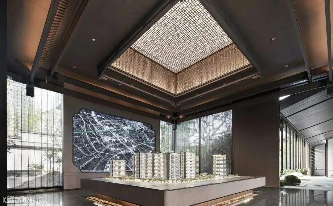 沙盘区顶部天窗借鉴古时的门窗布局,别致的造型与纯色背景互补,在繁华与简约中找到平衡,沙盘中的现代模型又带着精致的时尚,成为传统设计的衬托,两个时代在此时碰撞在一起,过往与未来的关系更为紧密。