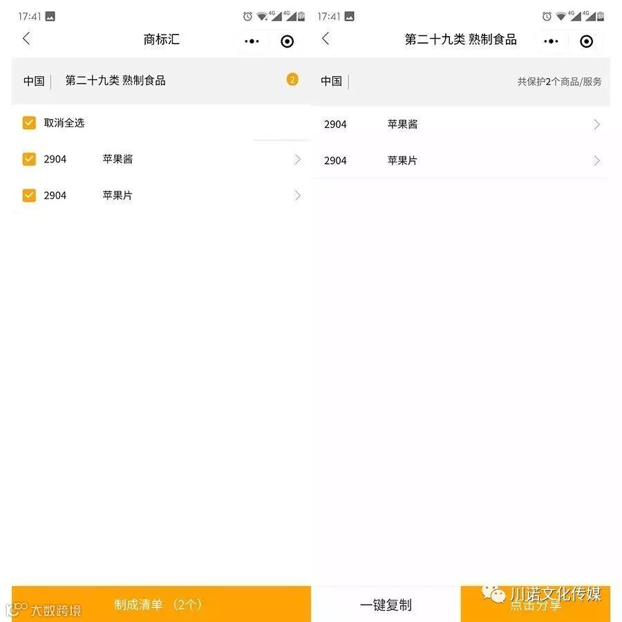 以中国为例,输入“苹果”,就可以查到各种类别的商品服务了,然后你可以选择你想要的类别服务,即可添加到我的商品中,便可立马制成清单,最后还能一键复制或者分享。
