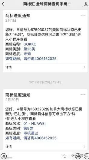 值得一提的是,“添加到管理”后的商标进度还会有个进度提醒功能,也就说你关注的商标如果进度发生变化,那就会在微信中实时提醒你哦!