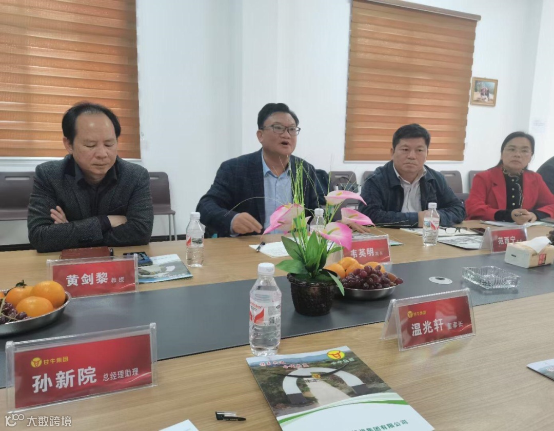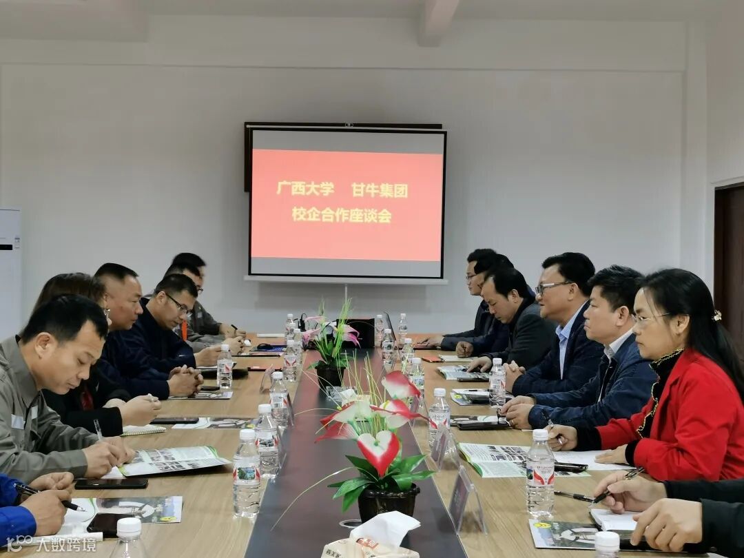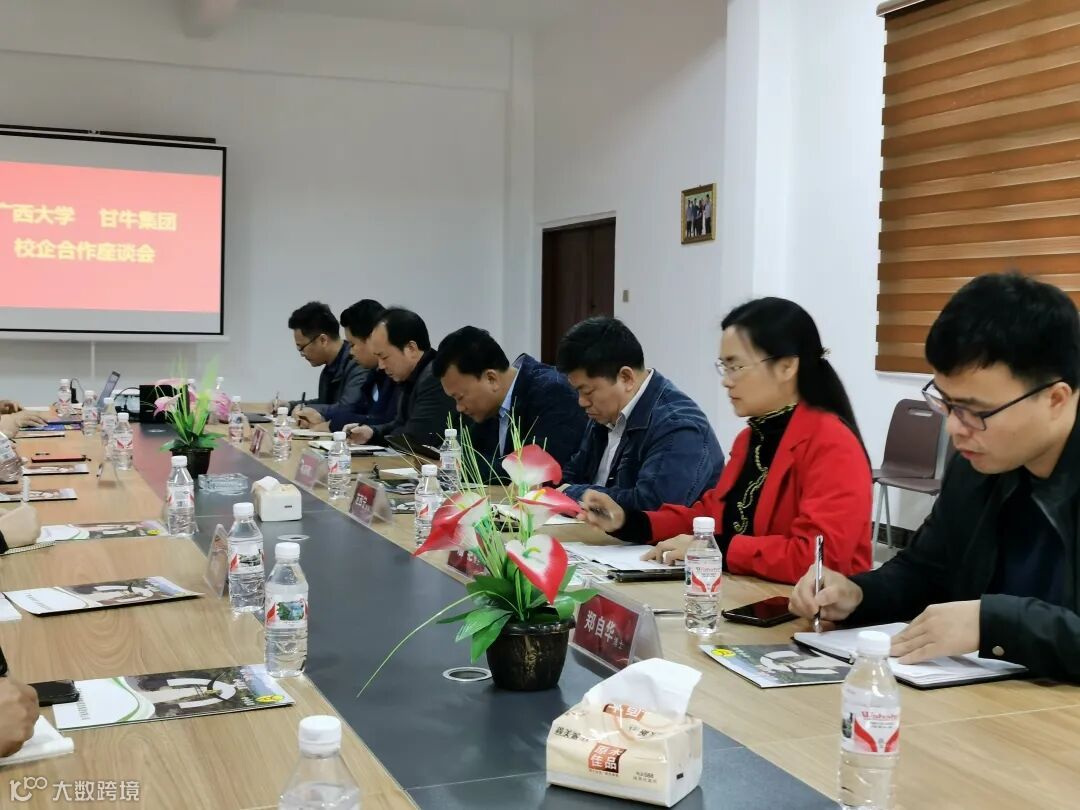 2021年4月11日,由广西大学农牧产业发展研究院院长韦英明带领广西大学动物科学技术学院的博士、教授,以及自治区扶贫办扶贫项目管理处处长范西宁、广西水产畜牧业协会会长秦泽亮、副会长黄剑黎等一行八人,与甘牛集团董事长温兆轩、董事何建明、企业管理层、技术人员共20余人,双方就以“种牛繁育”为核心议题开展座谈会。具体商议肉牛现代种业、饲料饲草、生态养殖、疫病防控、产业经济及屠宰加工等领域,洽谈技术研发、产业化应用、人才培养等合作,为共同打造具有区域竞争力和影响力的产教融合示范与产业人才培养基地,提高企业自主创新能力,做强做优甘牛品牌。