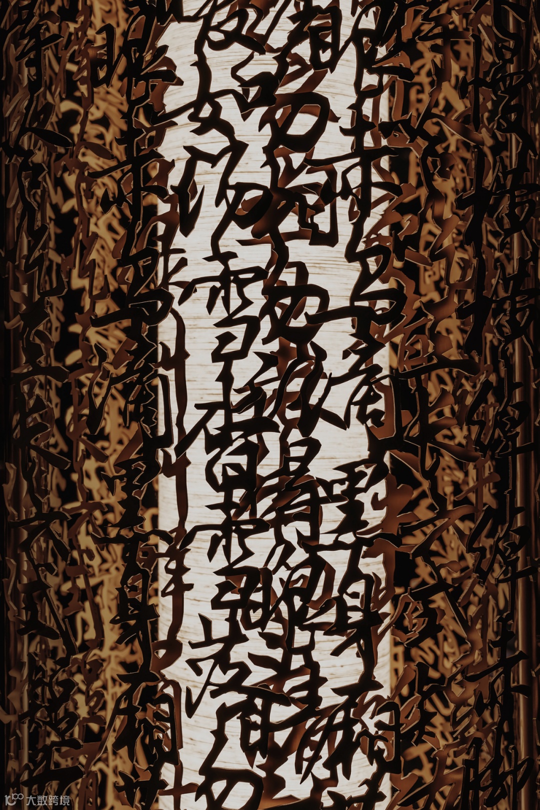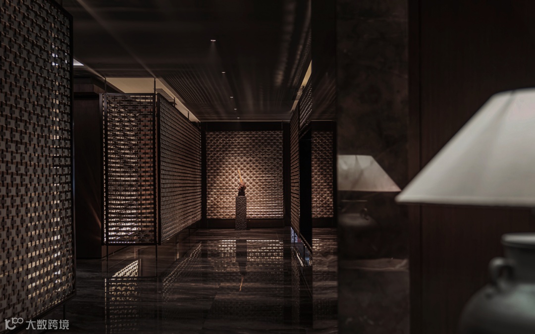 会所以镂空式棕色墙面作为过渡区域,复刻古时门型。微暗的光线基调增强体验感,走廊处摆置浪花、园林置石等中式意象雕塑,以抽象艺术的形式重新铺排历史时光。