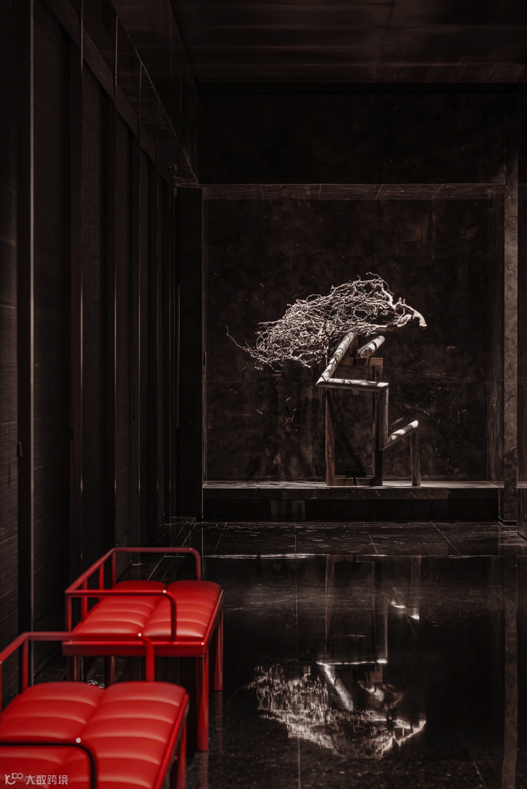 谈话区中部拥有一座艺术装置,十余个红色“高脚杯”将花束高调托举,底座的亮红色与花朵在光线下呈现的暗红形成渐变,间接引发视觉动线。