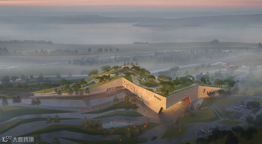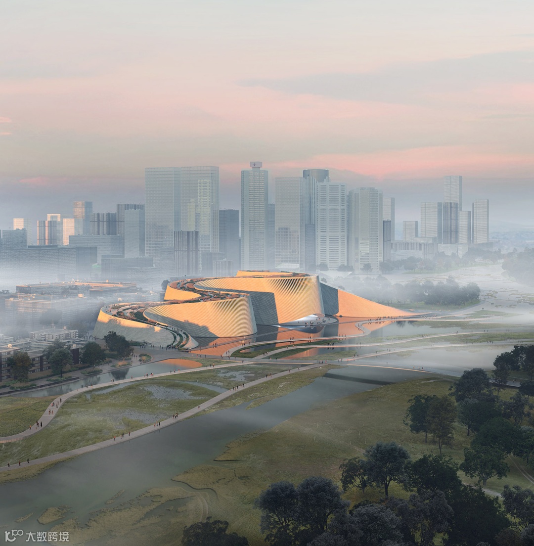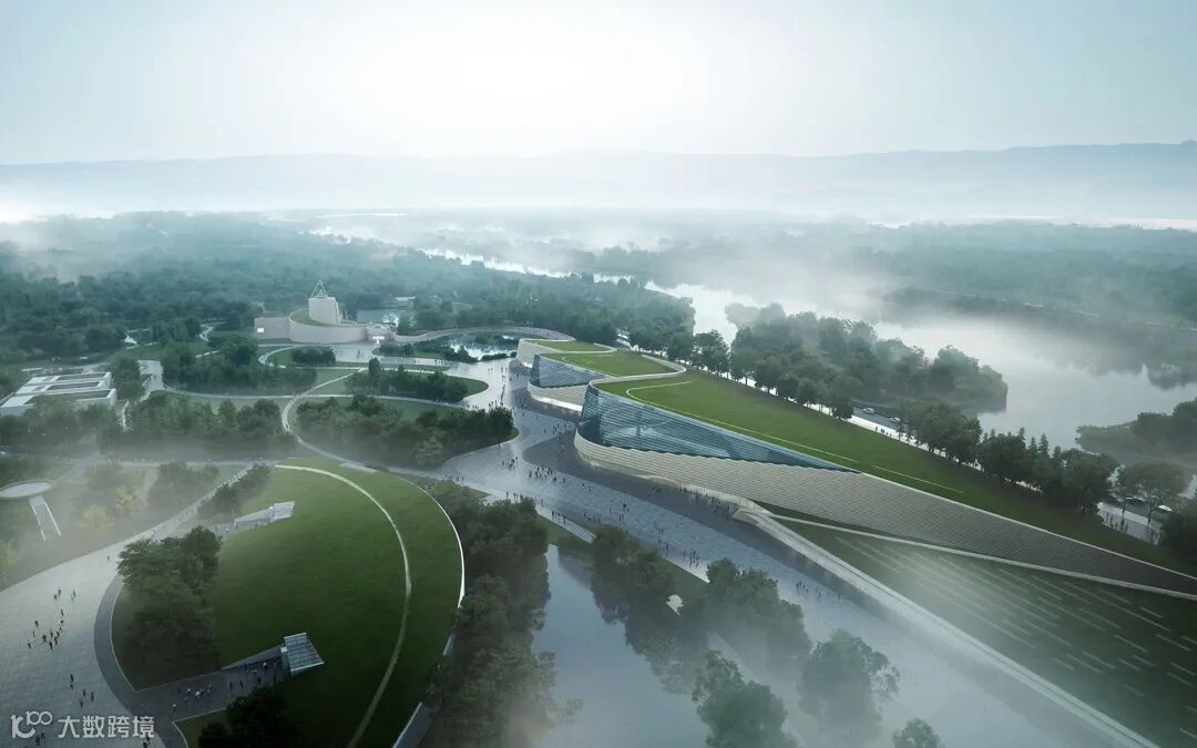 博物馆位处郑州北部,将成为新规划的黄河国家文化公园的一大亮点。建筑主体如一方磐石,由堤岸山峦中孕育而出,流线型外观与自然景观浑然一体。