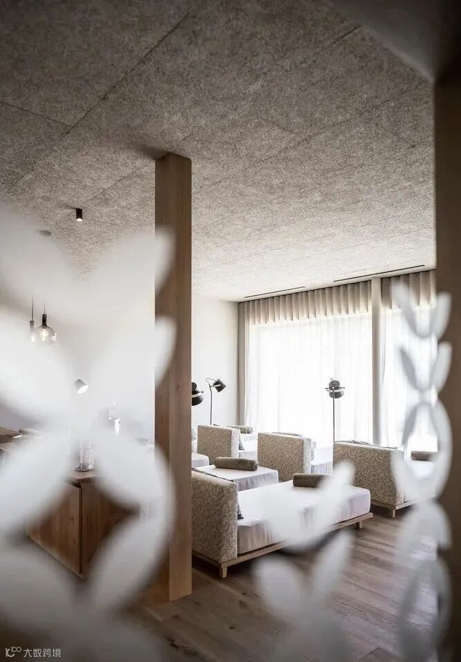 所有的傢俱都是定制設計,色調輕盈自然。但最重要的是,每個房間都有一扇巨大的玻璃窗,與立面重合,展現出驚心動魄的景色。“我們面前什麼都沒有,只有松林、牧場和山脈”。房間配有露臺,木質地板,提供了更多的生活空間。