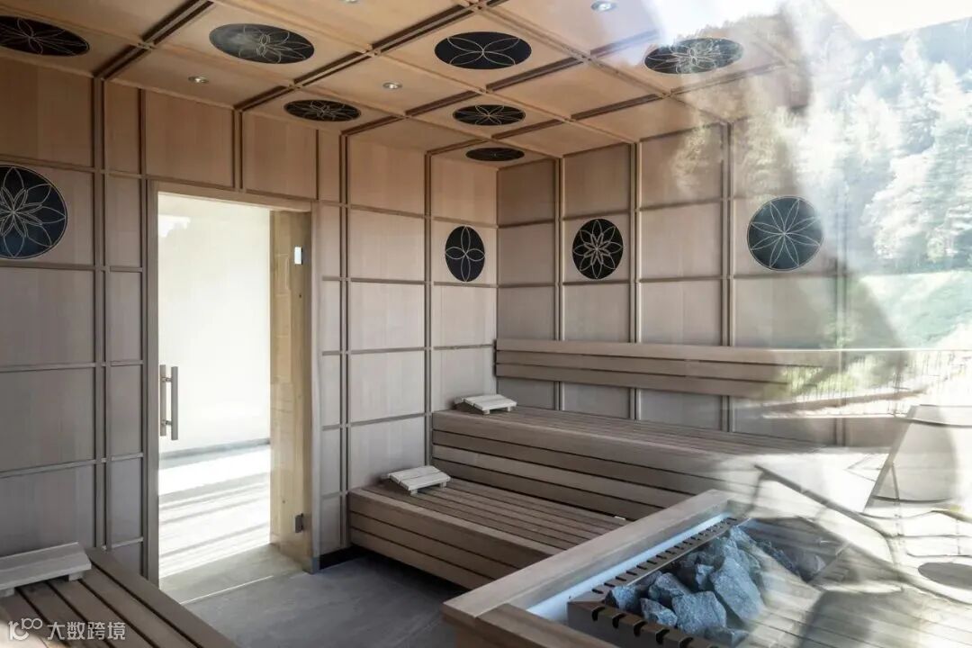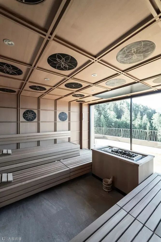 同樣位於一層的健康區也與客房共用壯麗的景色,並延伸到木質露臺上,客人可以在溫暖的月份進行日光浴或簡單放鬆。在裏面,6個小木屋創造了完全木制的迷你房間供個人使用,讓客人有隱私和寧靜,而他們所躺的柔軟床墊與地板幾乎齊平。定制設計的躺椅圍繞裝飾。在健康區有一個芬蘭浴和生物桑拿房(後者溫度較低),這裏也有一片全景玻璃窗。