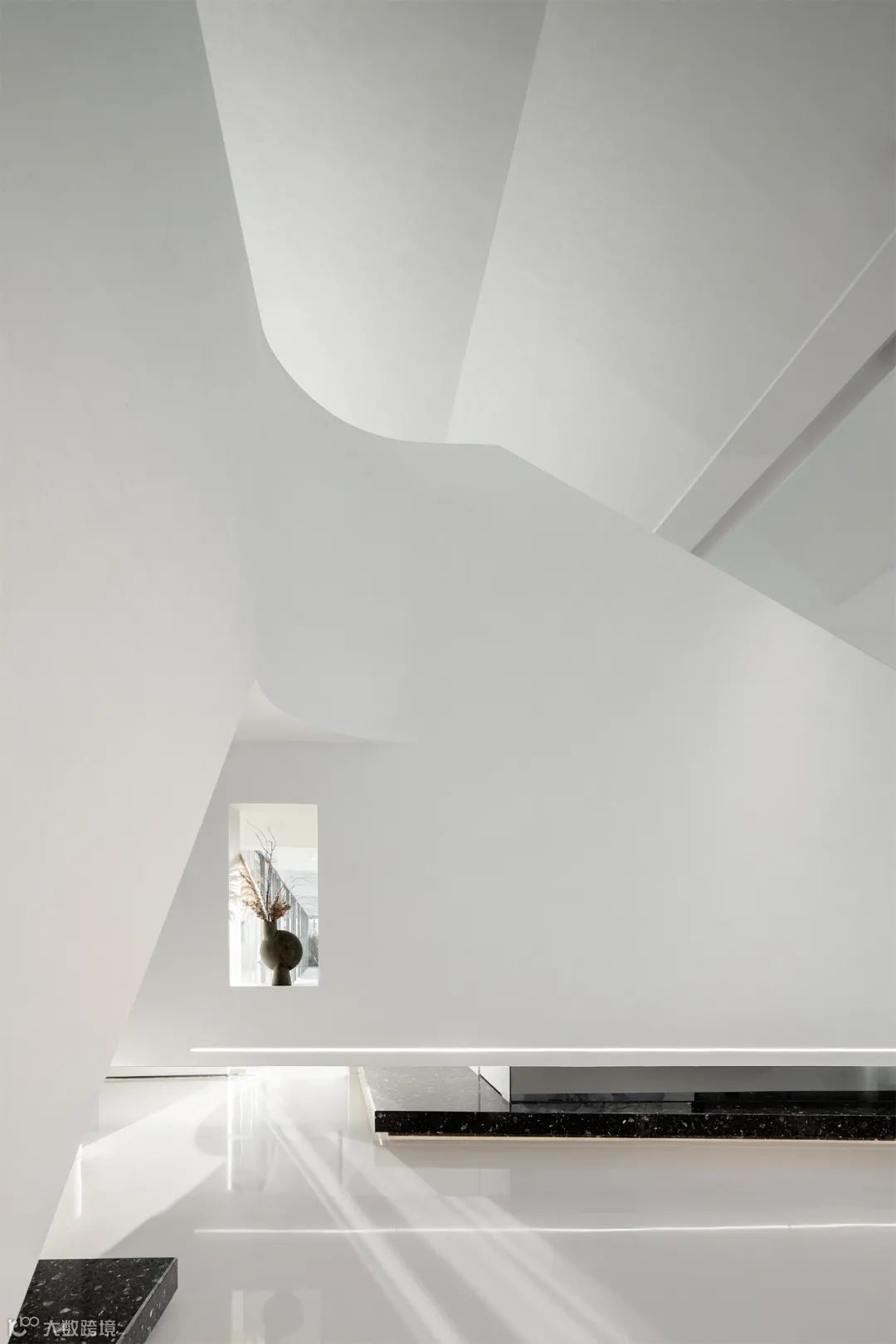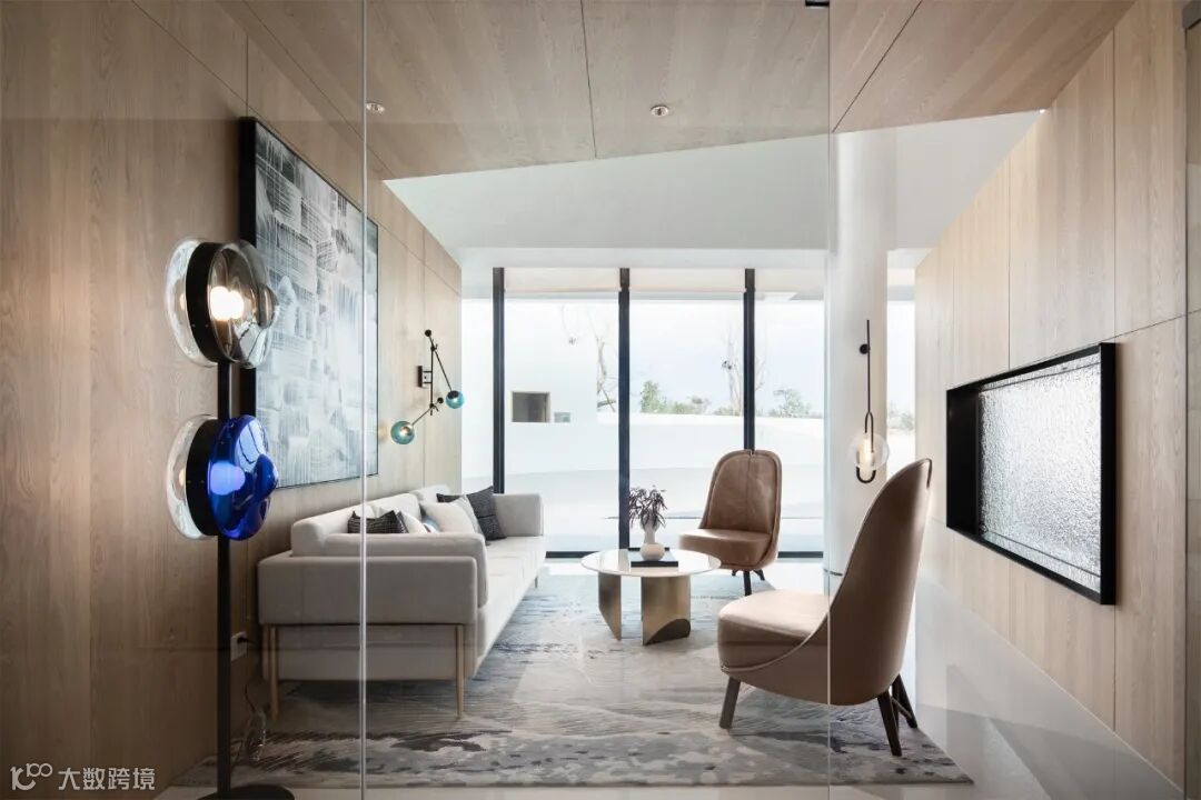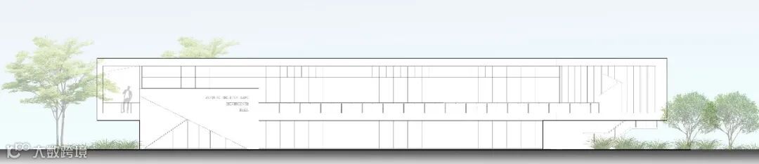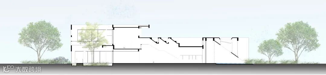 沿艺术梯可到达位于夹层的交流空间,夹层区与斜下方的沙盘区和斜上方的室外庭院,均有视线上的交流与互动。