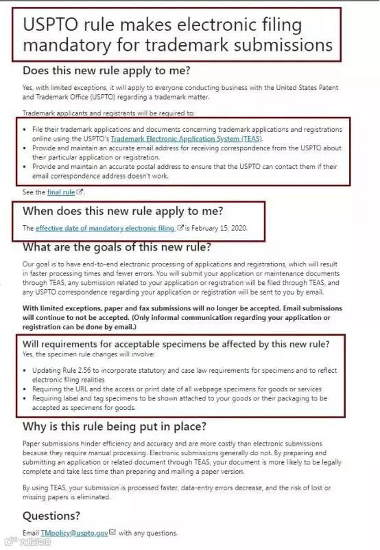 新规内容大致是:2020年2月15日之后全部实行电子申请。由于纸件提交会影响效率和准确性,而且比电子提交的成本更高,因为它们需要手工处理。电子提交通常不需要,而且对于准备提交的申请或相关文件,你的文件更可能在法律上是完整的,比准备和邮寄纸质版本花费更少的时间。通过使用Teas,您的提交将得到更快的处理,数据输入错误将减少,丢失或丢失文件的风险也将消除。