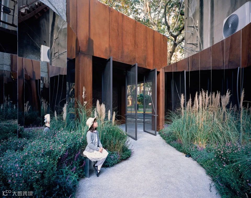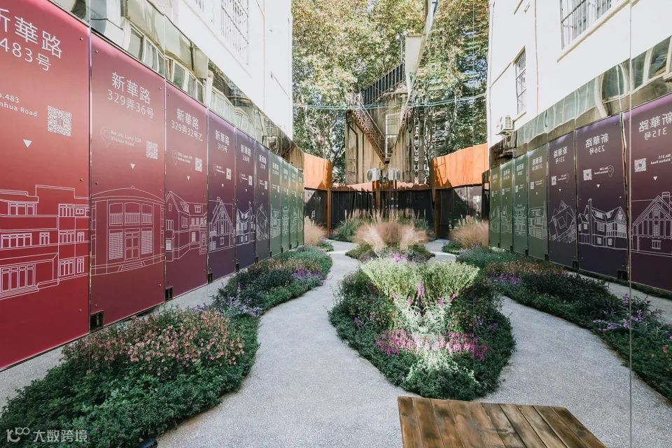 由耐候钢形成入口,设置了一个关于新华路历史建筑的永久展。设计师认为整个新华路应该被看成一个鲜活的博物馆,而这里将成为介绍众多珍贵历史建筑的小序厅。花园里的植物系统,通过三种不同高度的植物搭配,建立丰富的层次及与人身体的关系。以鼠尾草、满天星、矮蒲苇、粉黛乱子草为主的花草组合呈现充满自然野趣的植物氛围。