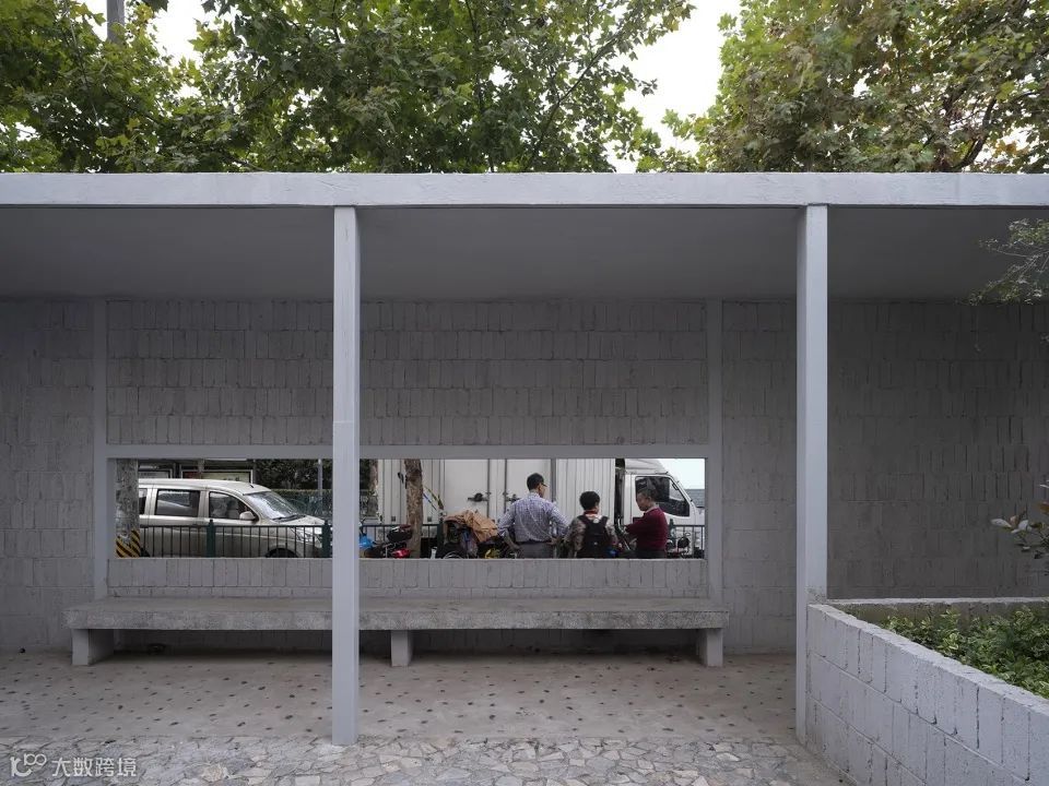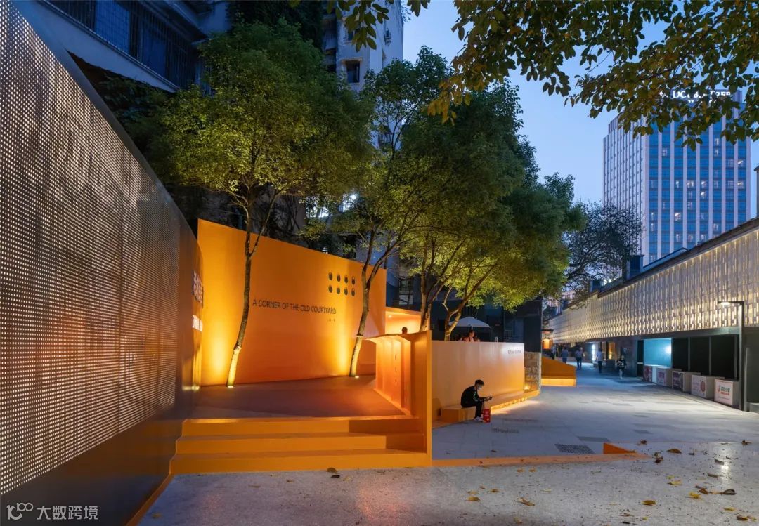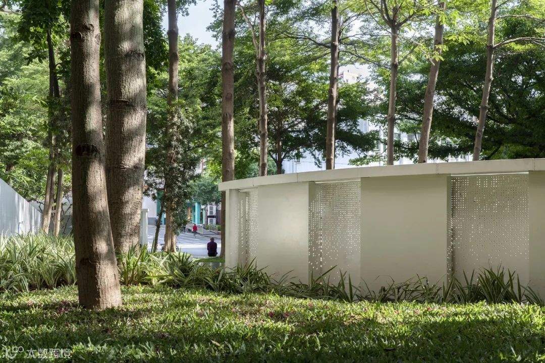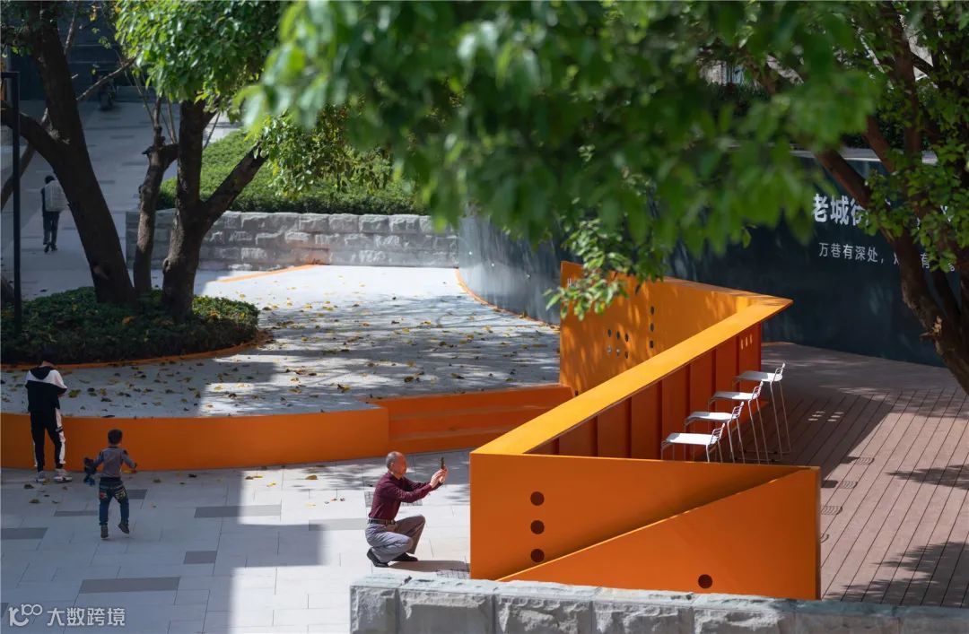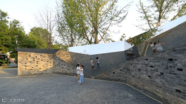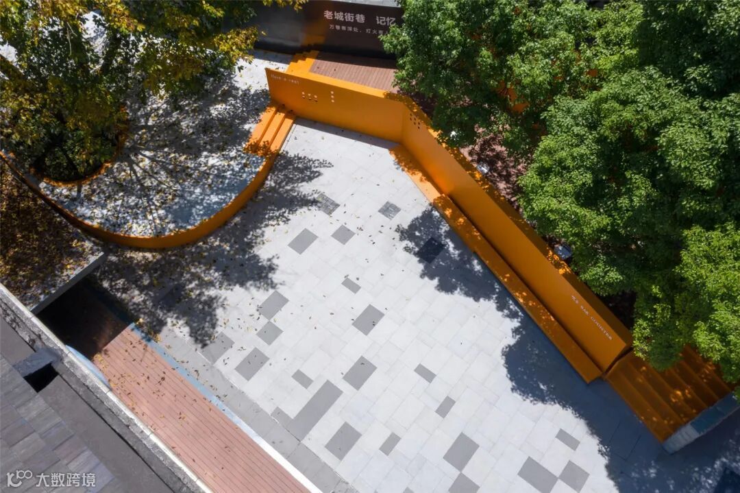 设计师在距离较小的位置,采用了平直的处理,与两侧实体墙相连接。在距离较大的位置,采用了曲面的设计,使路过此处的人们能有更多的角度进行观赏。而划分比例较大的“墙上痕”在较远的地方观察或者直视时,通透性非常好,视线完全可以直抵后面的老墙体,呈现消失的感觉。