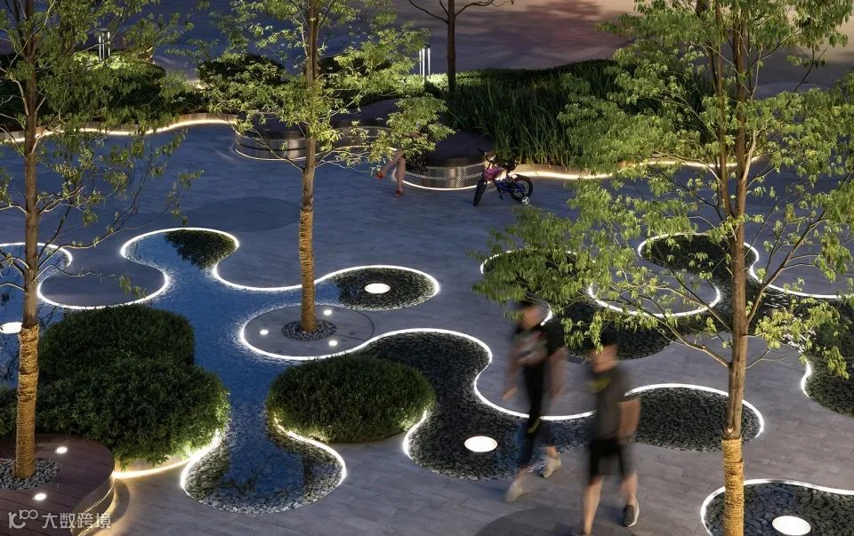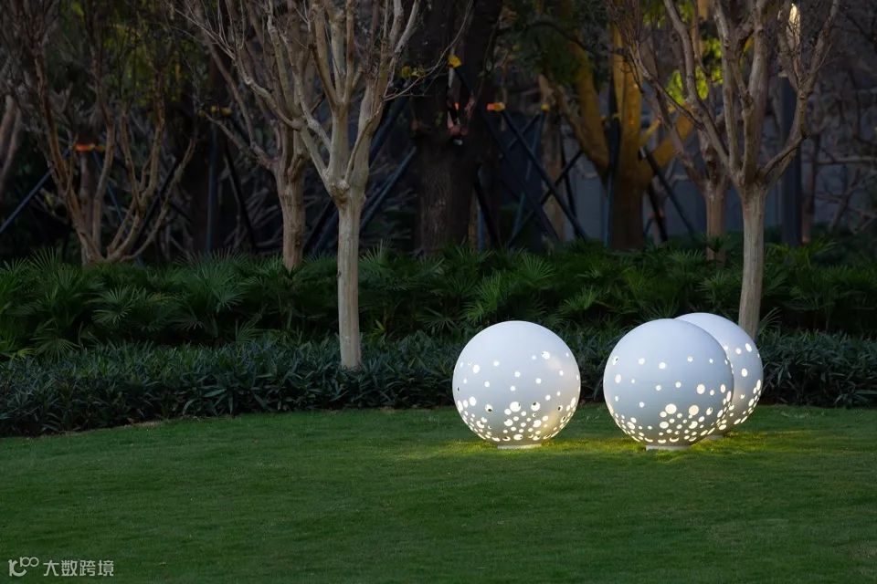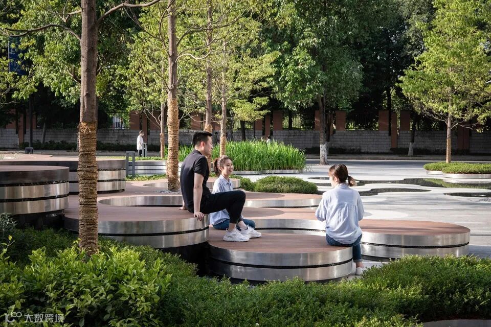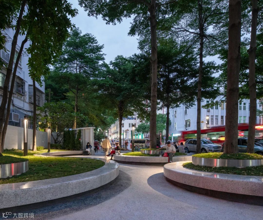 为了让使用者能更关注到草坪的存在,设计师刻意分出另一个高程,把草坪托举在亮眼的不锈钢圈上,精致地“捧”到了人的眼前。设计师还额外关注到草坪在日夜更迭中的场景变化,夜幕降临,景观照明光晕越发明显,一滩一滩自然散落在弧形的坐凳上。
