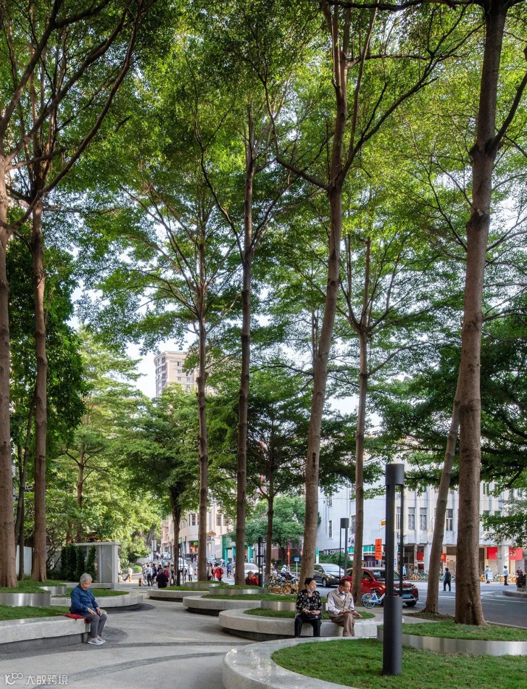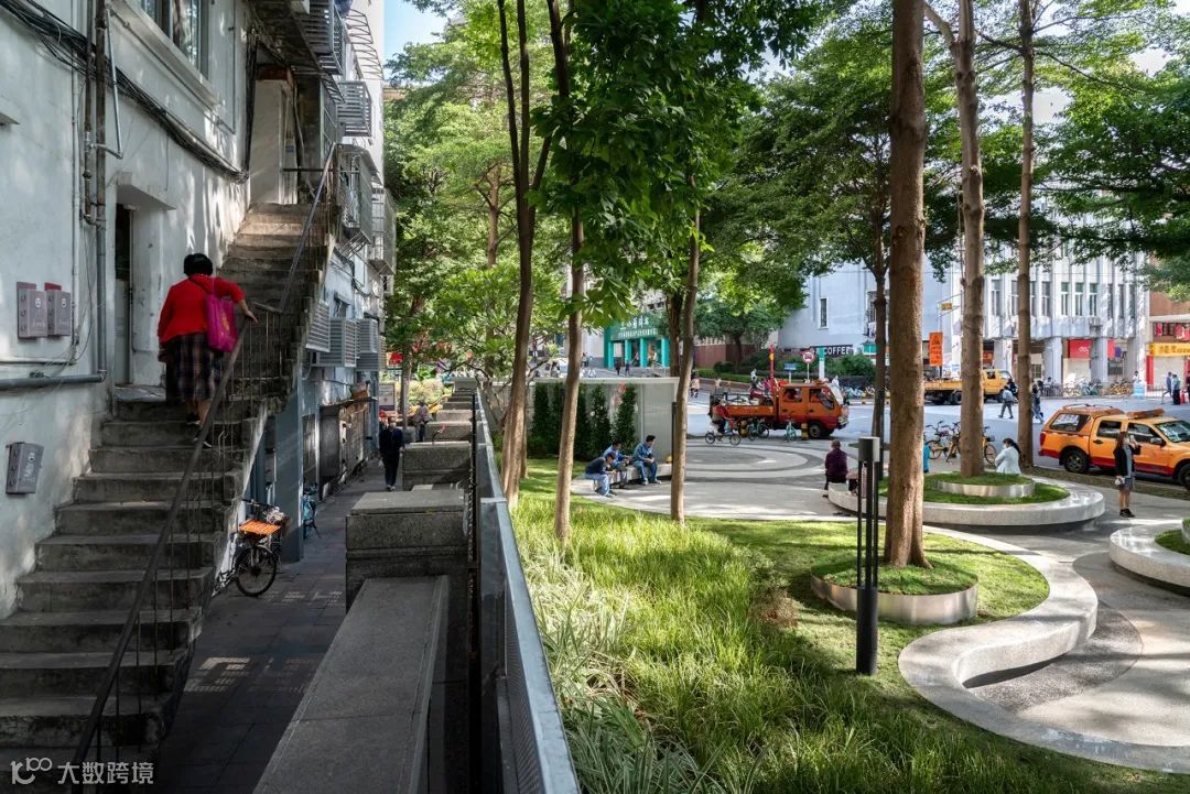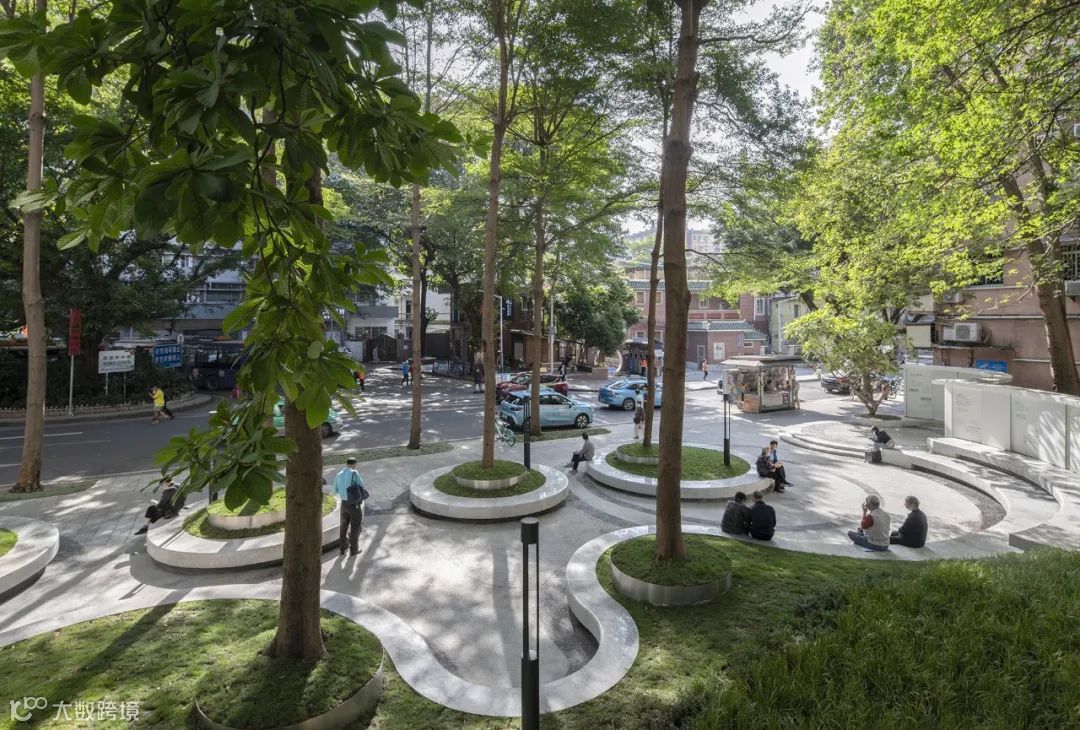 追溯“渔村”的设计理念,设计师在地铁路口交通的一侧,致敬了古老的村头——一方场坝,一棵大树。纷繁复杂的城市化进程中,人来人往的新老社区之间,无论你是不是赶得上“时间就是金钱”的高速列车,这里有一方记忆的场所,林荫下老人们在这里闲聊享受,城市空间里冷漠的关系渐渐变得柔软。