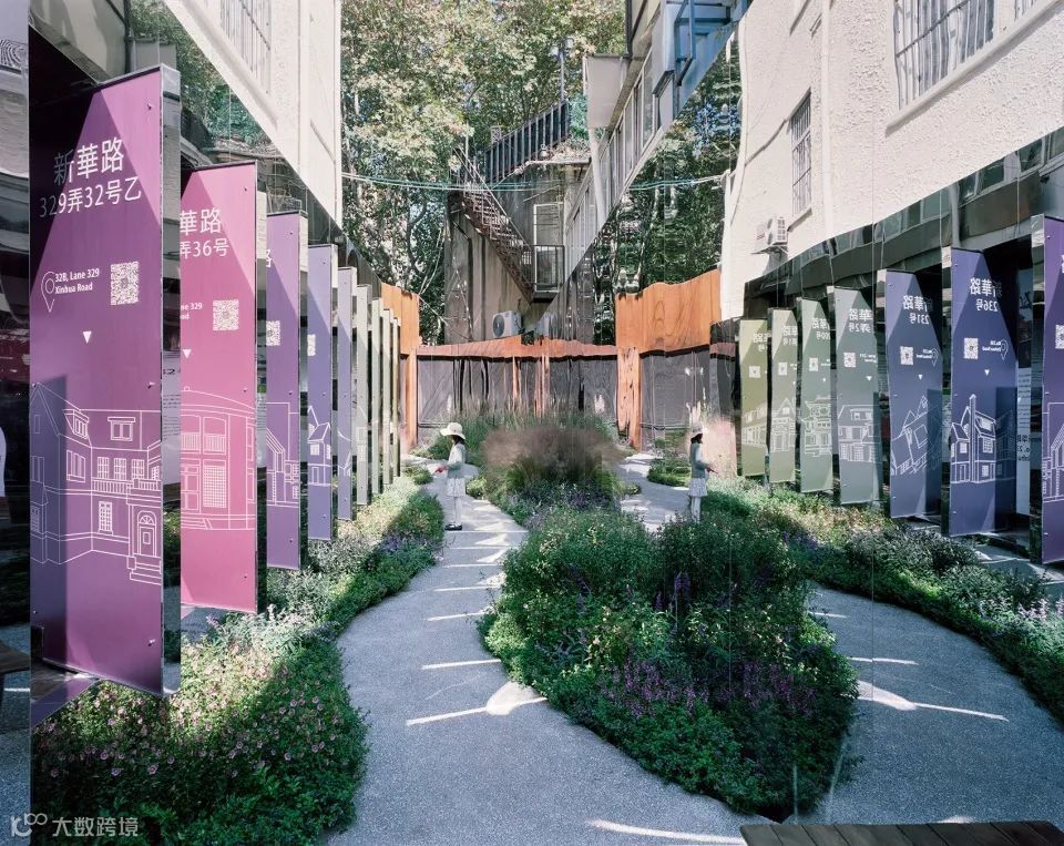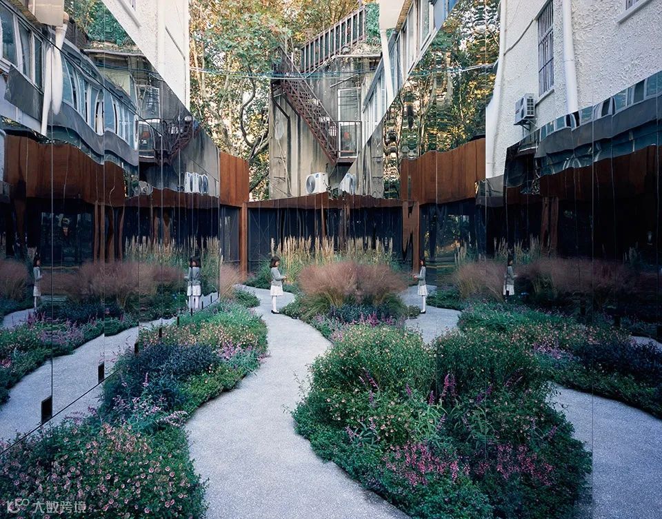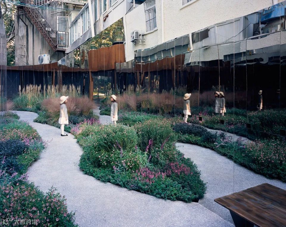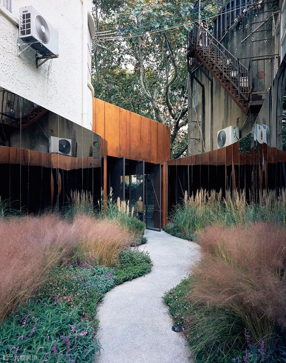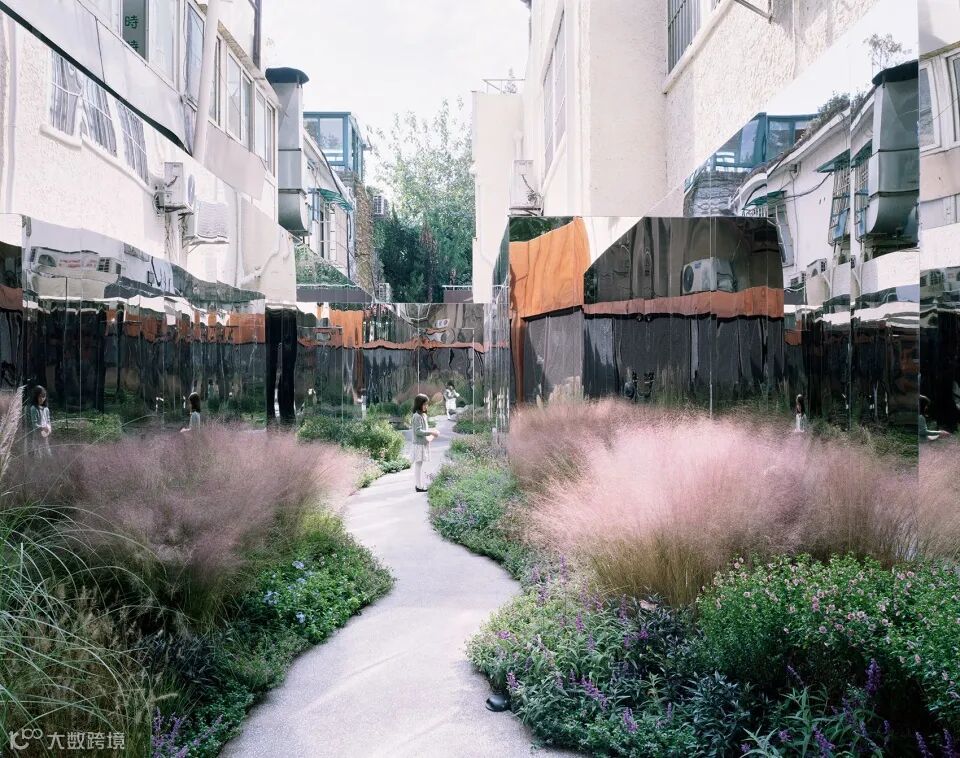 水石设计首先在内部弄堂两侧墙面上设置了镜面不锈钢系统,作为整个设计的核心。两边的镜面系统将无限反射中间的小花园,当人从中走过,仿佛步入一个无限的自然花园。部分镜面系统是可旋转的,旋转过来是一块块可更换的展板,形成一个可以持续提供内容的街头画廊。同时,两侧的镜面就像一个荧幕,记录着植物一年四季随时间的不停变化,不同的人在这里与镜面,植物的互动,呈现一道时间性的风景。