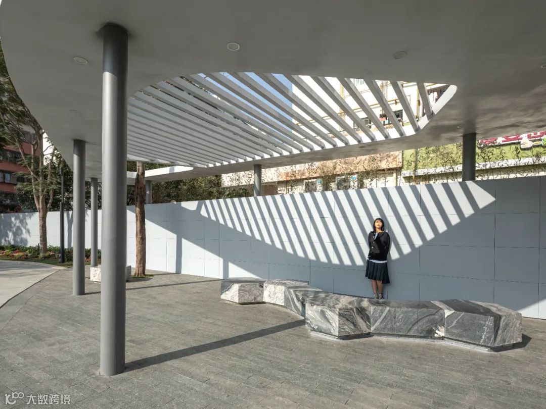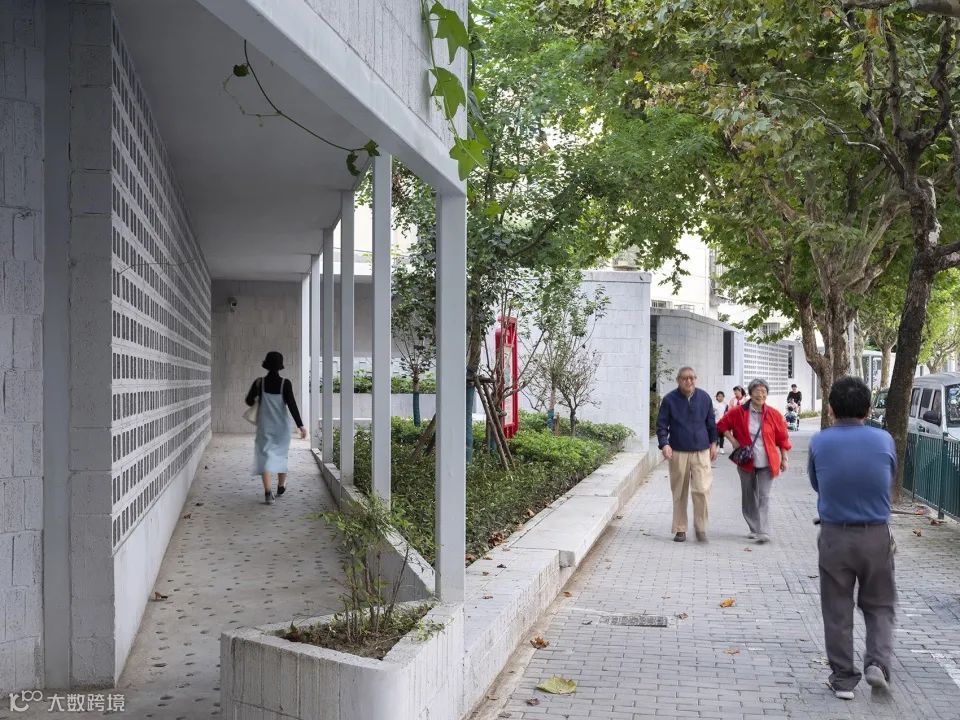 折线形的游廊富有园林意趣,也区分开各种区域,放学的孩子、等车的上班族、买菜途中休息的老人都能在这里找到需要的一席之地。曾经边缘化的社区围墙,也因此成为了最热门的昌里园。