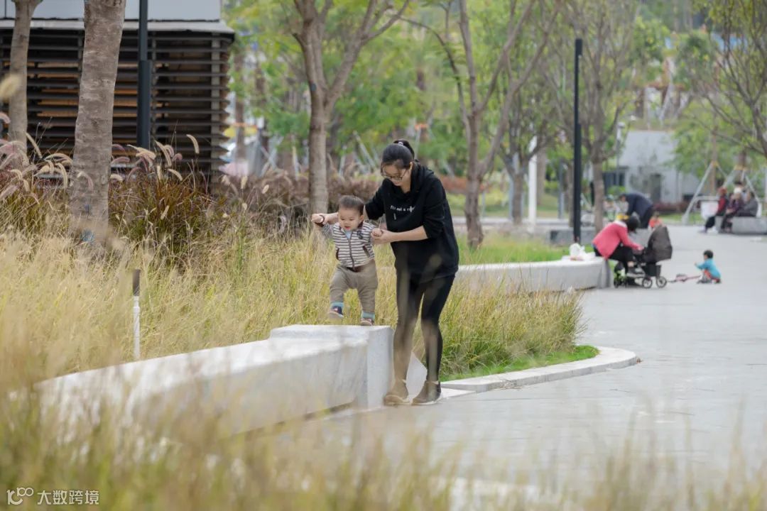 公园内有一套雨水生态循环装置,标志性的风车可以把风能转换为动力,让蓄积的雨水从 10 米高处飞流直下,景象壮观,也吸引小朋友来玩耍。就连公园里的路灯投影的灯光都是水波纹状,让草坪也流淌。整个区域的边边角角都精心打磨过,为防止小朋友受伤。