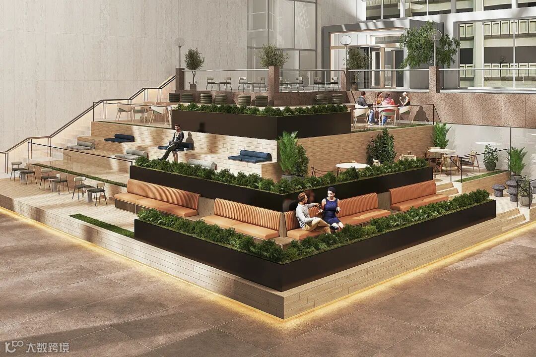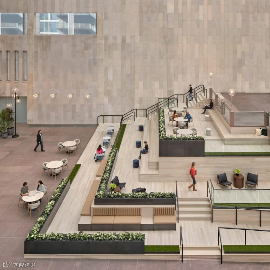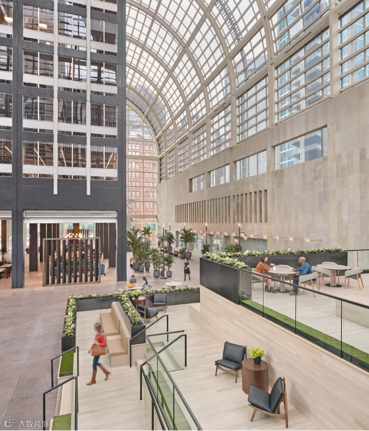 原本由约翰逊设计的的倾斜中庭环绕建筑首层大堂,在改造中,它被重新设计为室内“街景”的延伸。从入口处是中庭墙壁和开放式大厅之间的人行道,那里放置了长凳、绿化和模仿路灯的固定装置。