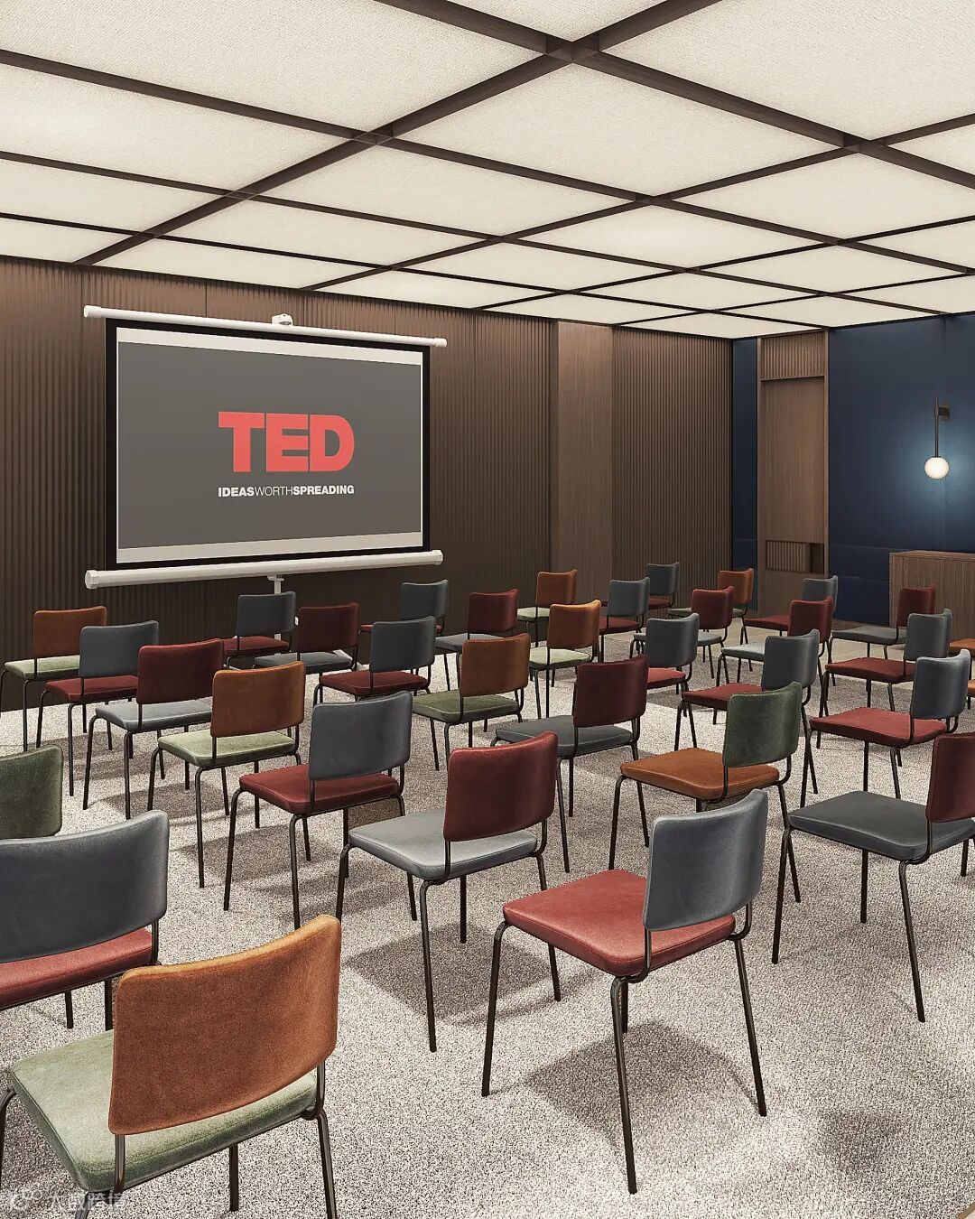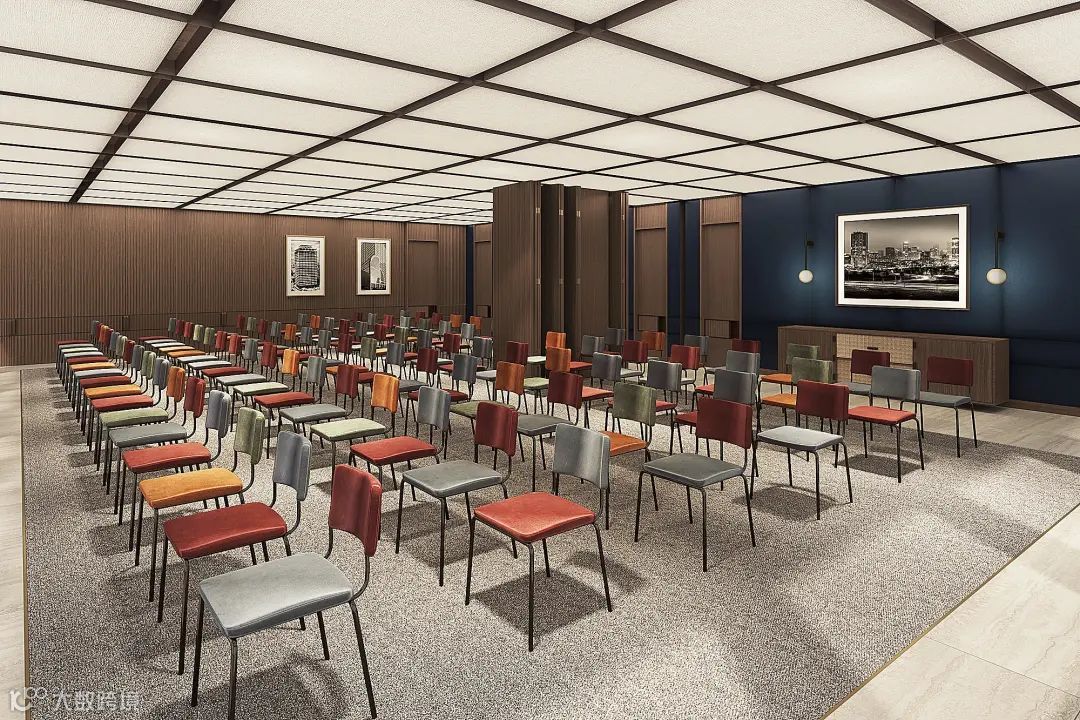 会议室场景布置充满古典主义风格,款式老旧的皮质靠背座椅,背景墙上的深棕色木制格栅,天花上的四方格,呼应着上世纪中叶的时代特性。