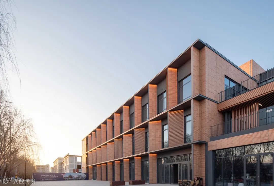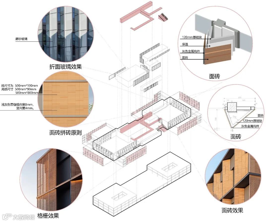 在我们的设想中,项目整体改变原先红白的色彩对比,运用温暖的陶木色系,更符合康养配套服务空间柔和的定位。囿于建筑荷载不支持任何的干挂体系,通过多种材料比对,最终我们采用长尺度面砖为主材,以三种相近暖色系色彩进行拼贴,经过反复试验模拟,选择最合适的拼贴节奏和色彩比重,形成大面有主调性、近看有细节的立面。