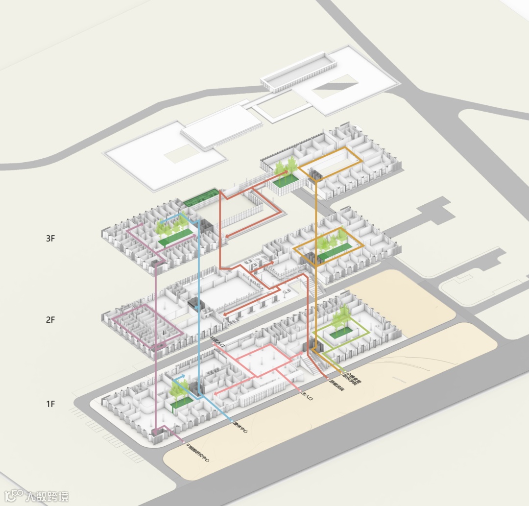 同时,我们以扬州何园的复道游廊体验为切入点,把中间空出来的部分设计成一个可以游走的园子,以立体的廊道串联不同“功能盒子”,这样使用者就可以在不同的标高上下行进、停留,在空间留白处看到湖景。