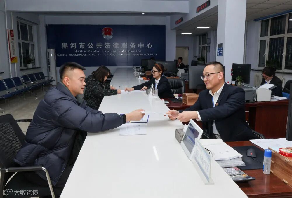 2024年12月10日,黑龙江省黑河市公共法律服务中心的工作人员在为涉外企业办理业务。新华社记者 殷刚 摄