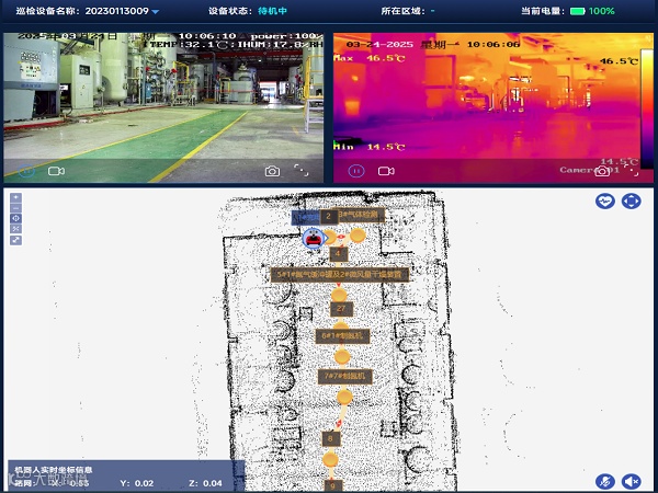 在历时两周的紧张测试周期内,技术团队巧妙运用激光雷达技术高度还原了厂房模型,成功完成了25个关键巡检点位的坐标标定,为机器人的精准巡检奠定了坚实基础。同时,针对温度、振动、跑冒滴漏、人员行为、气体等9类关键数据监测需求,技术团队深入研究、反复调试,精确配置了各类传感器的参数阈值。3月6日,首轮实测结果惊艳亮相。搭载多模态感知系统的智能巡检机器人,高效完成了巡检任务,数据采集准确率高达98.7%,这一傲人成绩充分彰显了机器人强大的数据捕捉能力与精准的运行控制水平。更为重要的是,该机器人成功实现了设备状态的实时监测与异常情况的即时预警功能,为生产过程的安全稳定运行提供了强有力的技术保障。