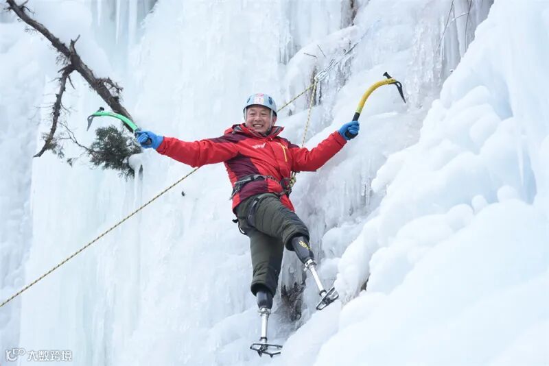 夏伯渝在北京房山区霞云岭攀冰(2017年1月17日摄)。因截肢而中断运动员生涯的夏伯渝,69岁登上珠峰之巅,成为极少数登上珠峰的双腿截肢者之一。新华社发