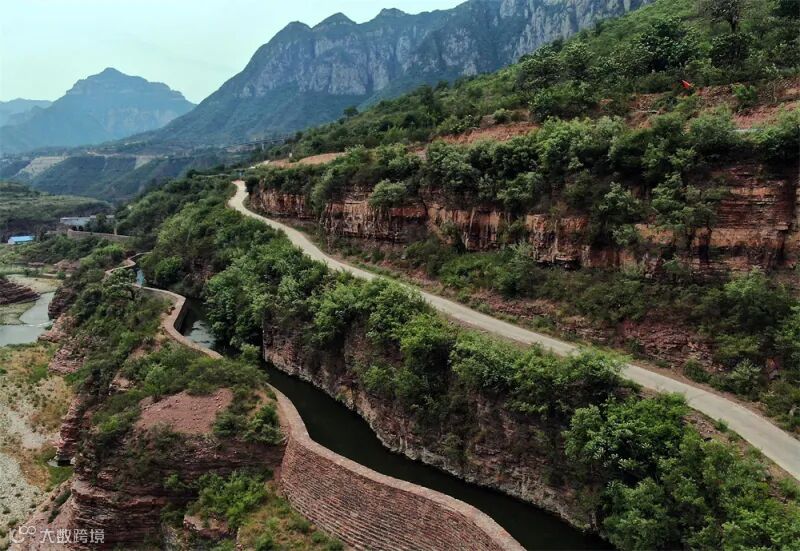 红旗渠蜿蜒起伏,如一条巨龙盘旋于巍巍太行山脉。