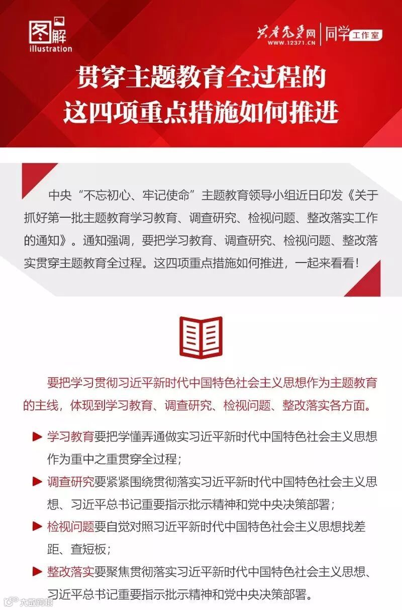 中央“不忘初心、牢记使命”主题教育领导小组近日印发《关于抓好第一批主题教育学习教育、调查研究、检视问题、整改落实工作的通知》。通知强调,要把学习教育、调查研究、检视问题、整改落实贯穿主题教育全过程。这四项重点措施如何推进,一起来看看!