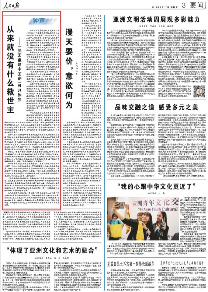从来就没有什么救世主。想当这个世界救世主的人,多是图一时口舌之快,最终都会以失败告终。不过,世界上总有一些人自以为是、狂妄自大,想以救世主自居,结果都会落得一场自编自导的荒诞剧,让世人掩口而笑。与其开口暴露无知,不如尊重事实,停止对中国的无端指责,正确看待中国发展,多做有利于中美经贸关系正常稳定发展的事。(阅读全文)