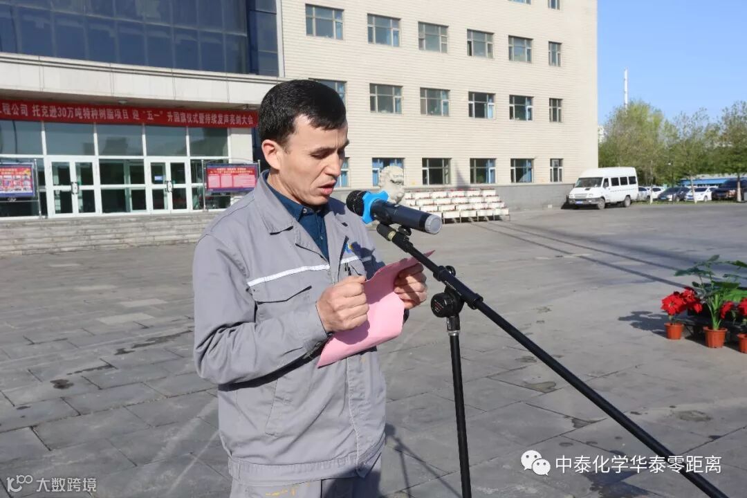 迎着清晨的曙光,升旗手、护旗手精神抖擞,迈着整齐的步伐入场,随着雄壮激昂的国歌声响起,全体员工肃然而立、凝神注目,鲜艳的五星红旗徐徐升起,迎风飘扬。大会由华泰公司总经理郑涛主持,中泰集团工程公司副总经理薄伟、华泰公司氯碱厂乙炔车间阿扎提江·努拉洪、华泰公司热电厂维修部玉苏普江·阿不力克木、托克逊30万吨特种树脂项目木巴热克·热苏力分别发声亮剑,华泰公司党委书记马中宇作讲话。