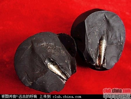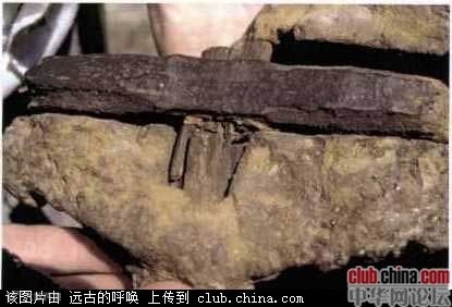 上图:1852年,苏格兰一处煤矿中,在一大块煤炭中发现一件形状像钻头的铁器,而煤块表面无破损,找不到任何钻孔。