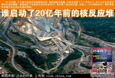 上图:法国有一家工厂于1972年时从非洲加蓬共和国一个叫奥克洛的地方进口铀矿石来使用,他们惊讶地发现,这批进口铀矿石已被人利用过了。因为这批铀矿石的一般含铀量相当低,和我们现有的核反应堆的废料几乎相同。这个发现,震惊了全世界,并吸引了世界上各国的科学家们来到奥克洛进行研究。研究的结果表示这是一个古老的核反应堆,由六个区域约五百吨铀矿石构成,输出功率估计为一百千瓦。这个反应堆保存完整,结构合理,运转时间长达五十万年之久。更令人讶异的是核反应所产生的废物,并没有扩散,而且局限在矿区周围。如果按现有的核子反应技术来看,这个反应堆的布局要比现在高明许多。