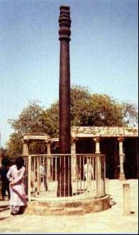 上图:在印度德里城附近的麦哈洛里, 矗立着一根公元五世纪铸造的巨大铁柱.这根铁柱高6.7 米, 直径约1.37 米, 用熟铁铸成, 实心, 柱顶有着古色古香的装饰花纹.据说这根铁柱是为纪念旃陀罗王而铸造的.