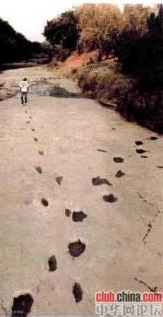 上图:在一九九九年的干旱季节中拍下河床上人与三趾恐龙的脚印清楚地交错而行,图片上通往人的站立处的脚印为人的,向右边的则属三趾恐龙的。